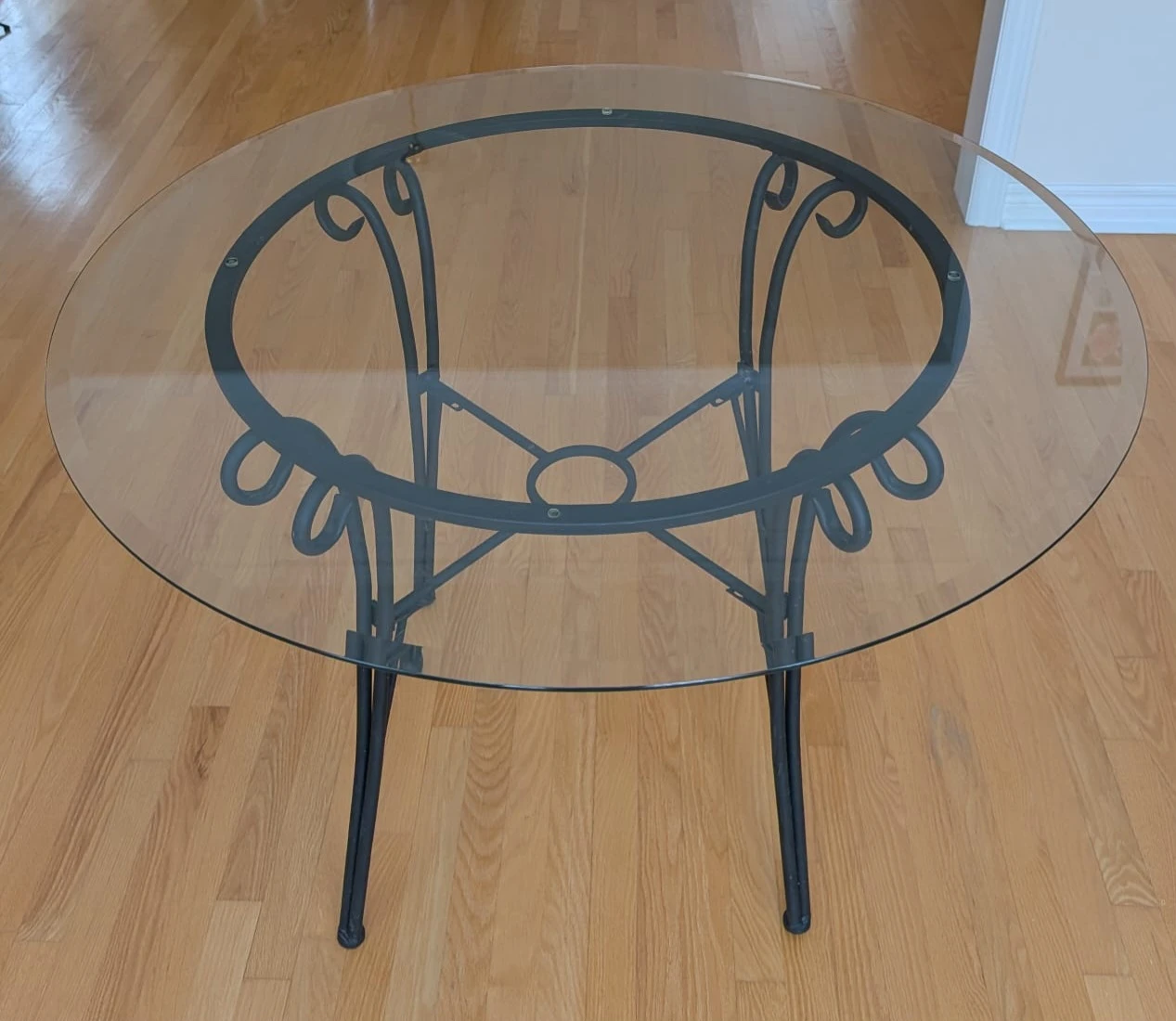 Selling a round dining table with a glass top and a black metal frame. It's in great shape and would be perfect for a smaller dining space or kitchen nook. The glass is clear and the metal frame has a decorative design. It's a stylish and functional piece!