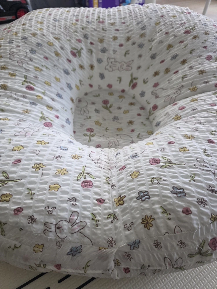 Selling a baby lounger! It features a cute floral and bunny design. It's in good condition and perfect for lounging around with your little one.