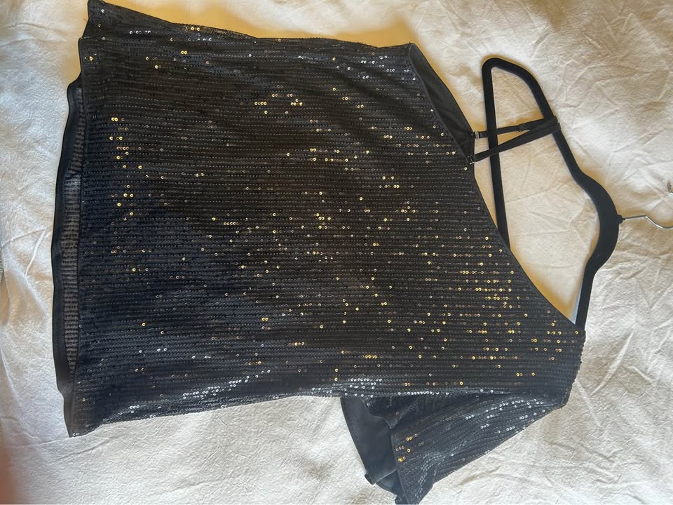 Worn ONCE, in NEW condition, this shirt is comfortable, modest (has an under layer) and yet still gives off a little mystery with the sequins and bare shoulder. Size XL.