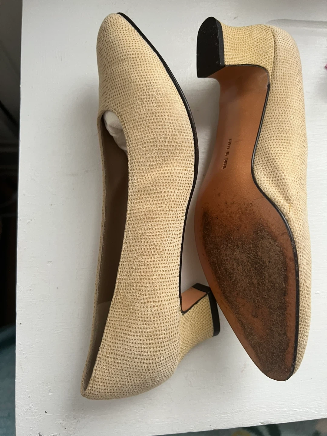 These Salvatore Ferragamo pumps are a classic and stylish addition to any wardrobe! They are made in Italy from beige leather with a subtle texture. Perfect for both professional and casual settings, these pumps offer a comfortable and chic look