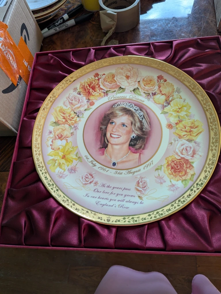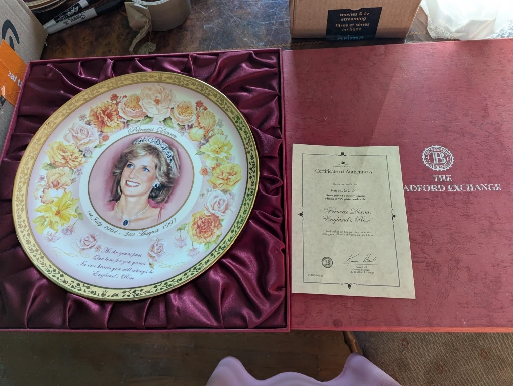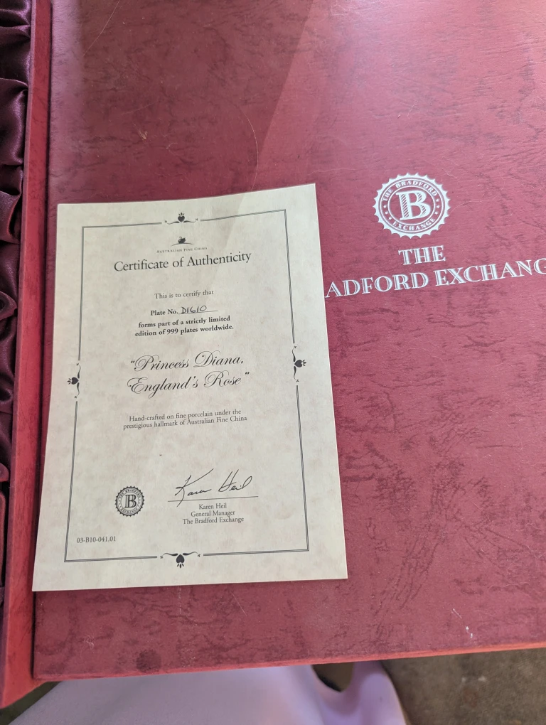 Selling a lovely Bradford Exchange collector's plate featuring Princess Diana, titled "England's Rose"! It's a strictly limited edition, part of only 999 plates worldwide. The plate is hand-crafted on fine porcelain under the prestigious hallmark of Australian Fine China. It comes with a certificate of authenticity and the original box