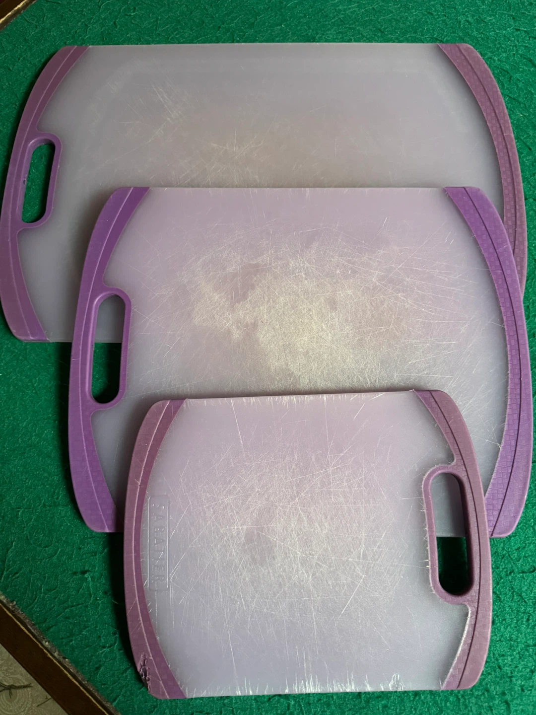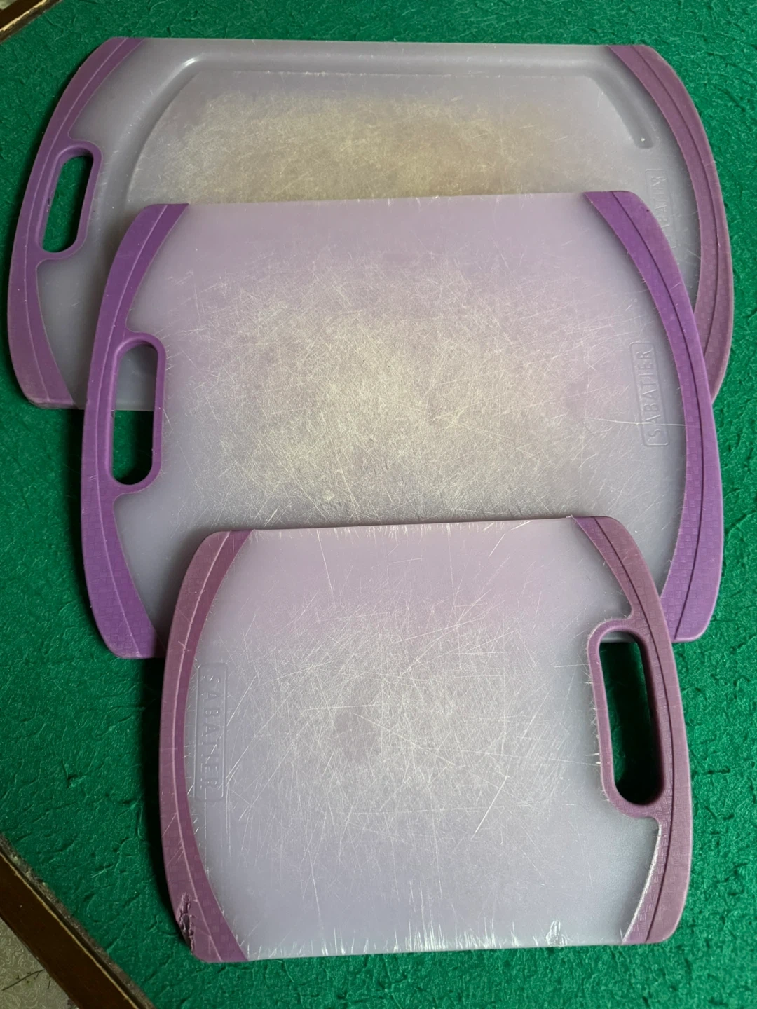 Selling a set of three Salter cutting boards. They are different sizes and have a purple trim. They have some scratches from use.