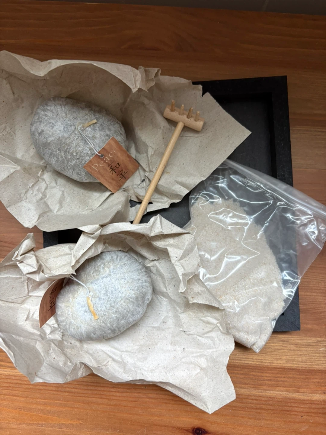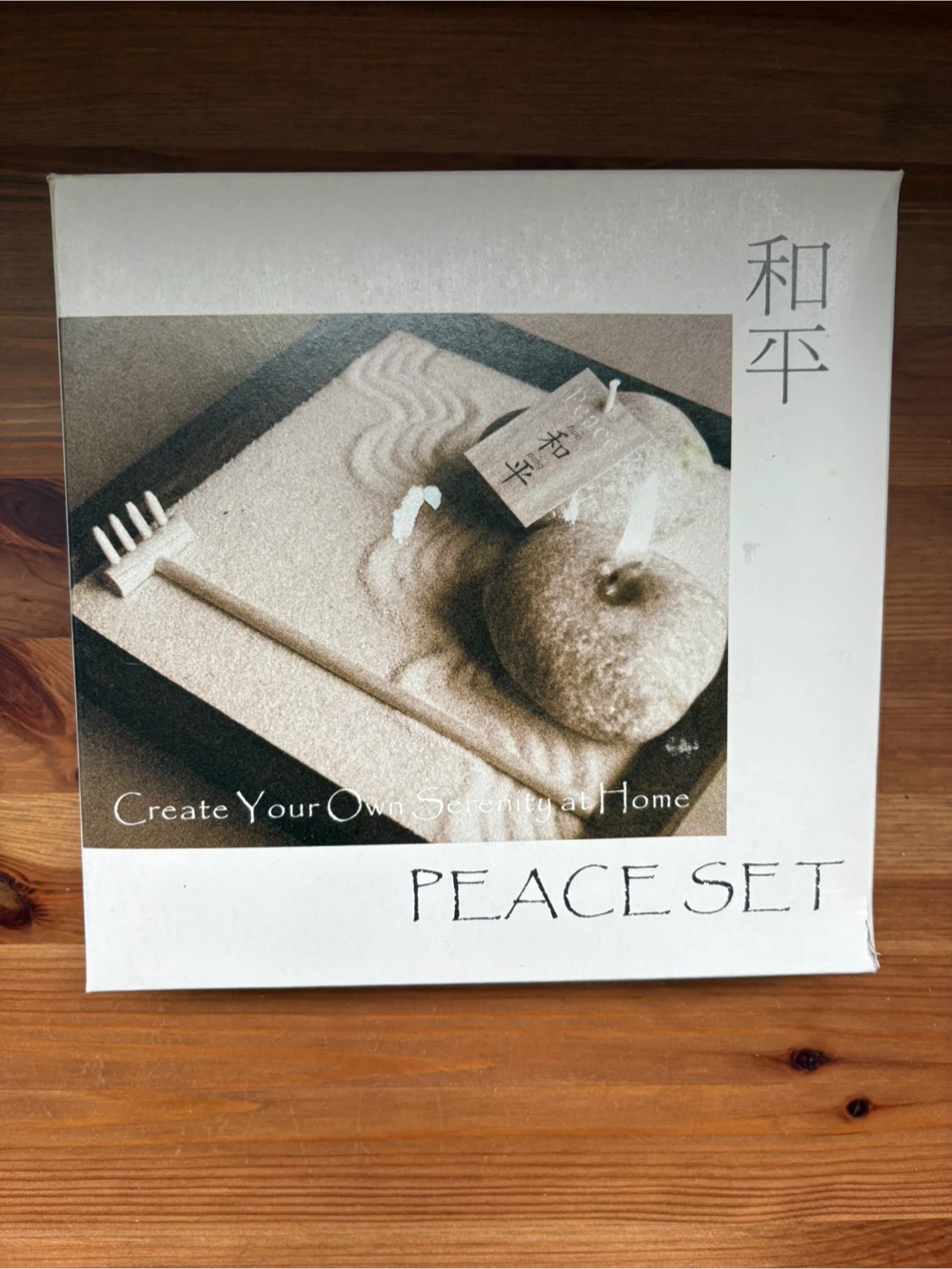Includes wooden tray, rake, sand, two candles