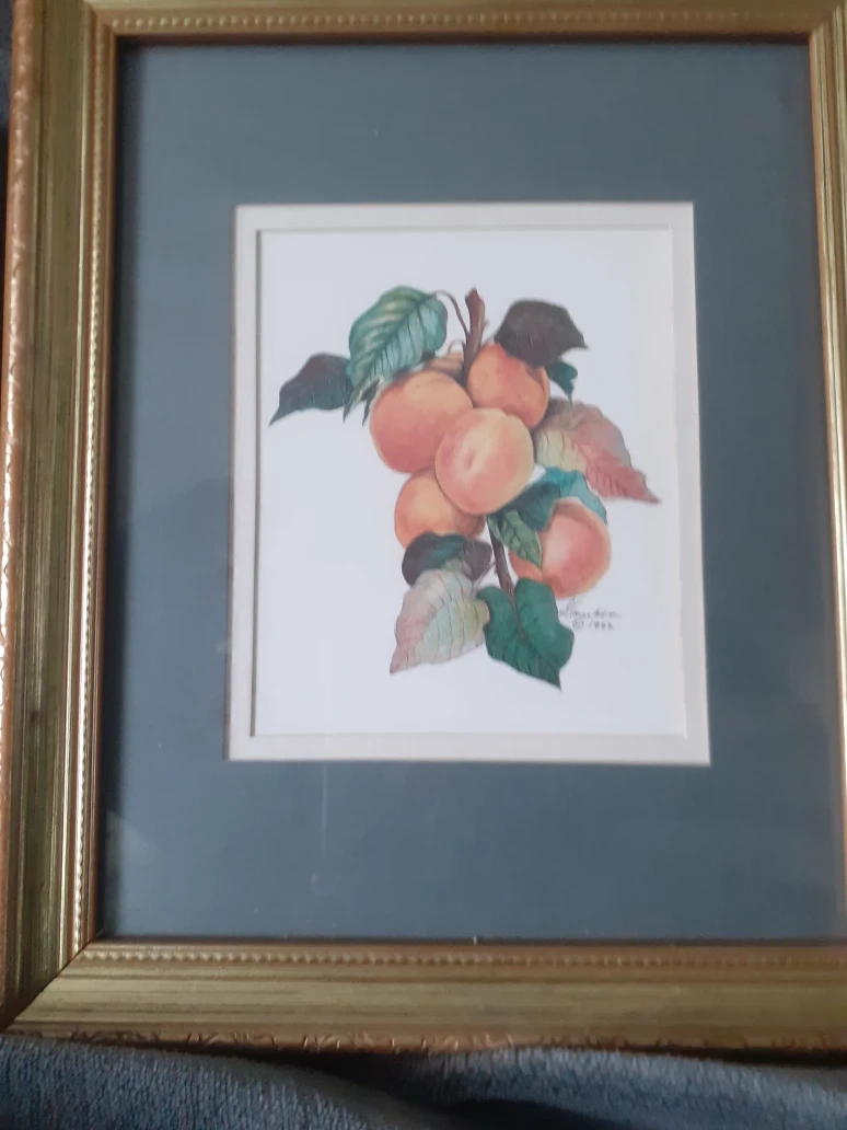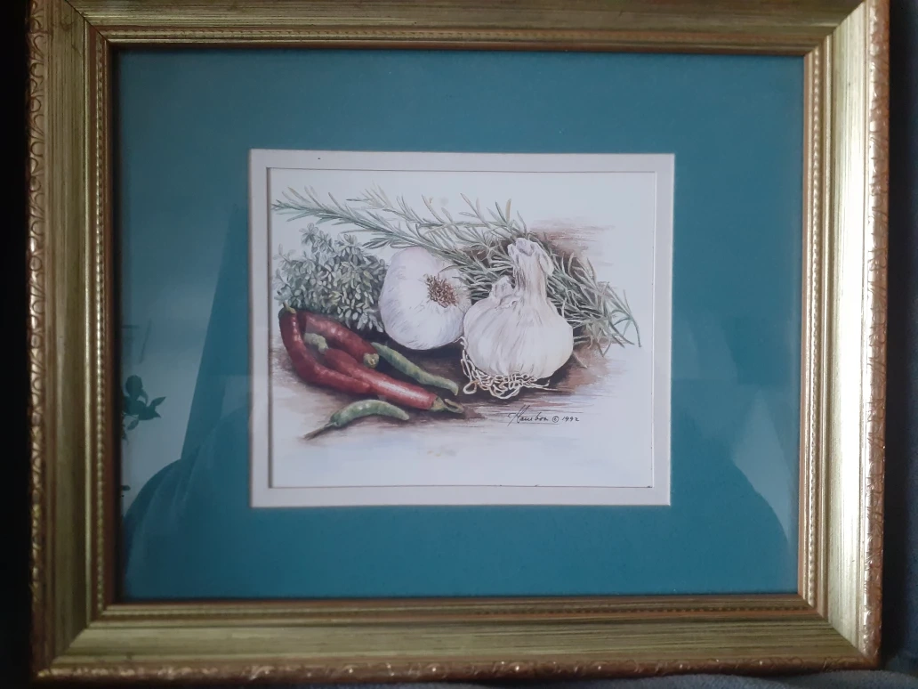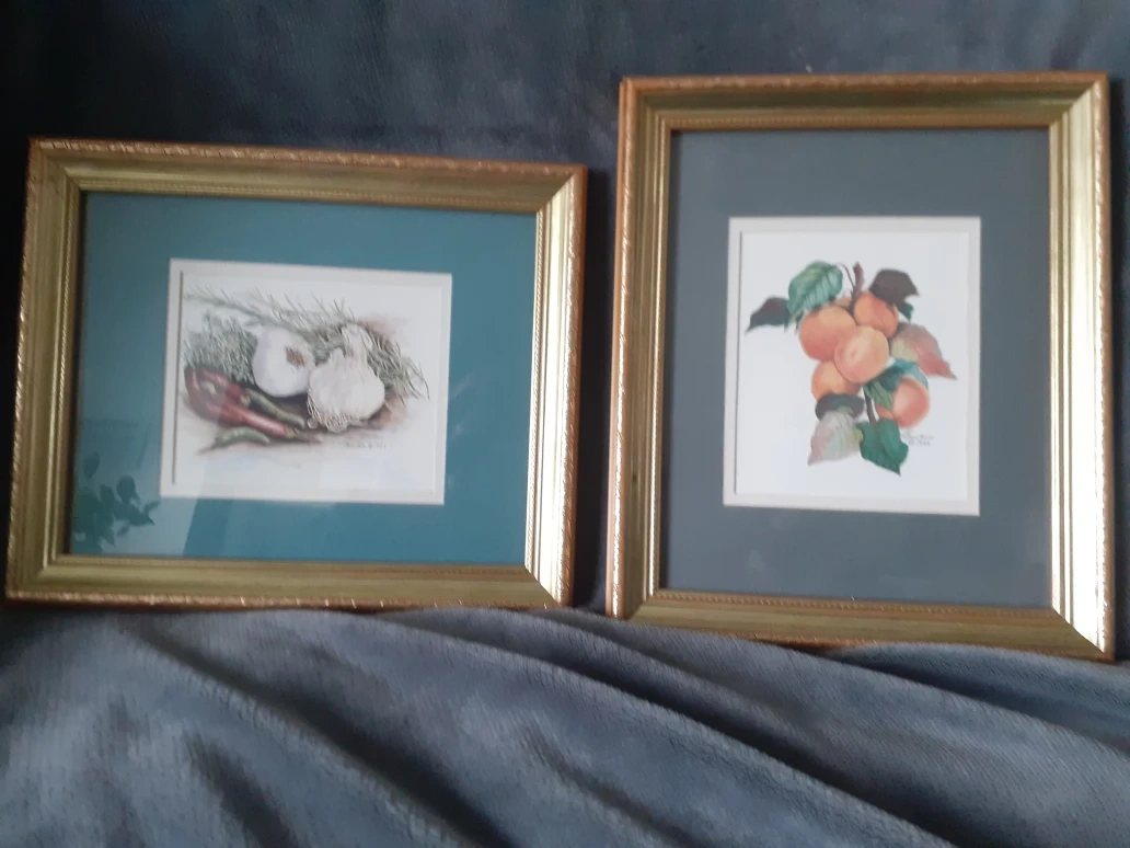 553Selling a set of framed art prints. Each print features a different botanical theme. One has garlic, rosemary, thyme, and peppers, and the other has peaches on a branch. They would be lovely in a kitchen or dining room Set by 2