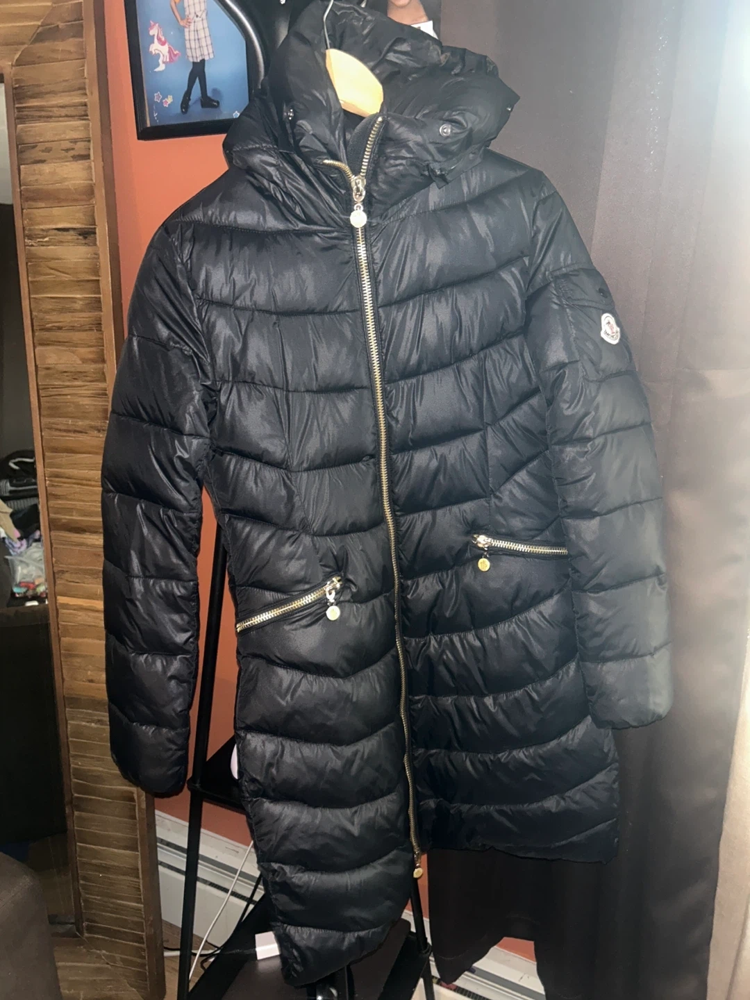 Selling a stylish Moncler black padded down coat. It's a size medium and made in Italy. Perfect for staying warm and fashionable!
