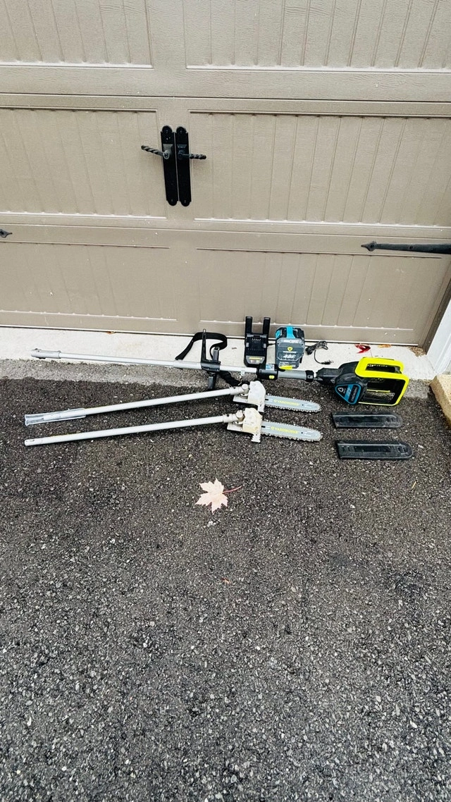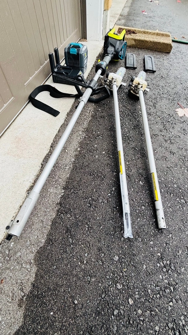 This cordless pole saw retails at Canadian Tire for $449.99. This one comes from an estate and is in like new condition. It appears to have hardly been used! As an added bonus, it comes with an *extra* bar, chain, and extension pole!! The battery charges up fully and holds the charge until your job is done. This unit works perfectly and has zero issues.