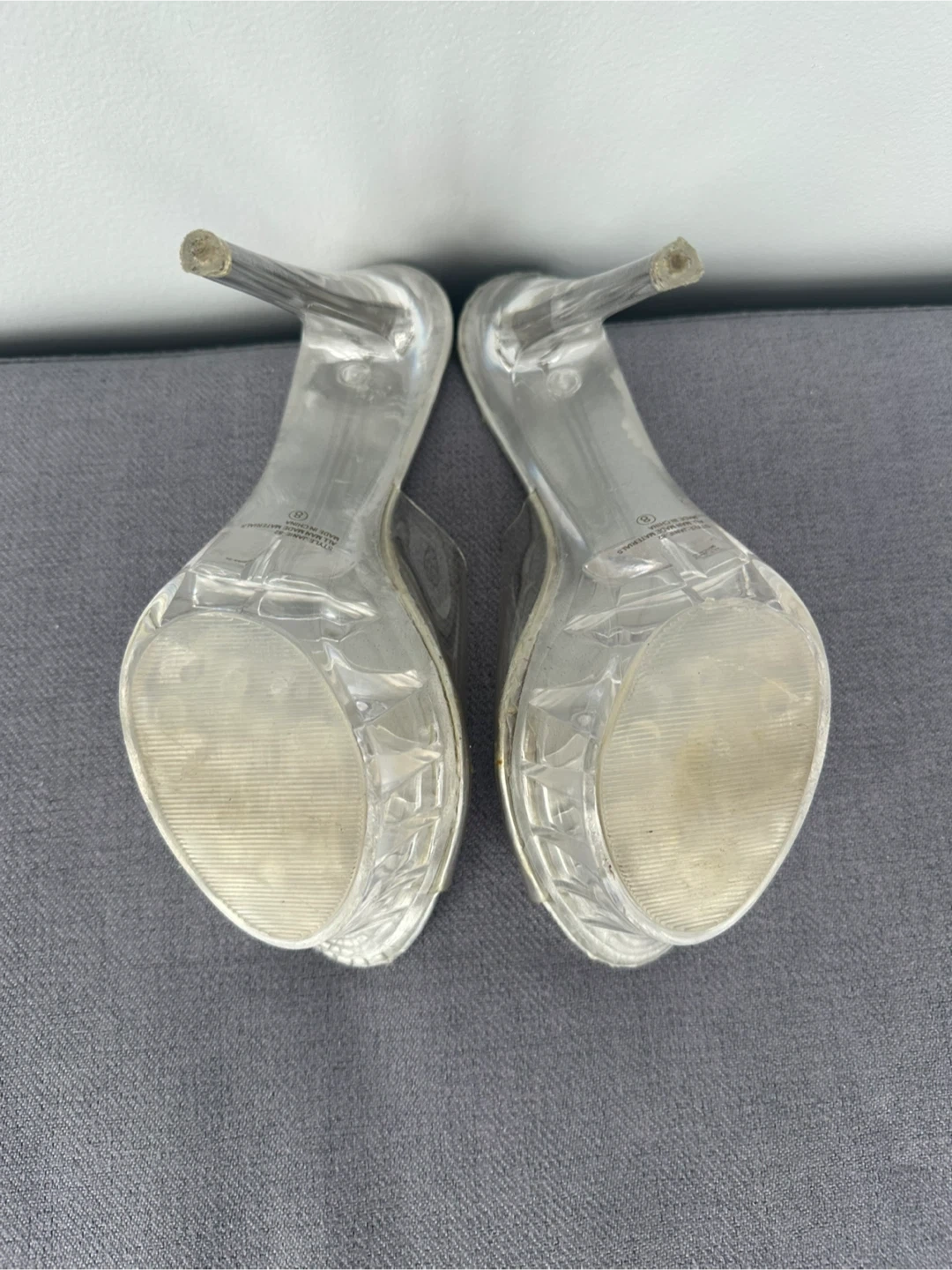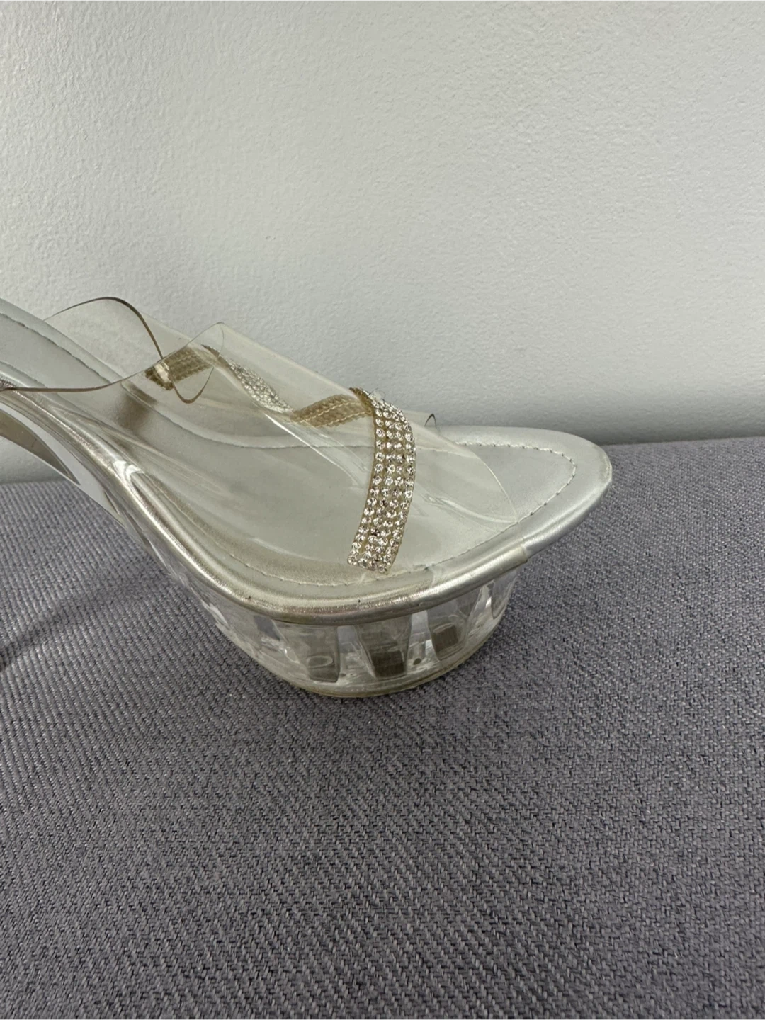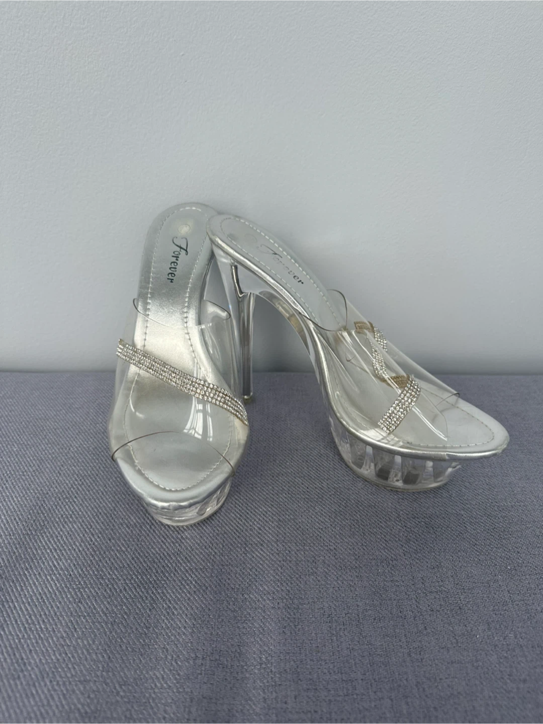 These are a pair of Forever brand platform heels, that are great to add height to your outfit. They're a clear, see-through material with a silver trim and rhinestone detailing. There are some rhinestones missing on the side of the right shoe. The platform makes them more comfortable to walk in. Size 8.
