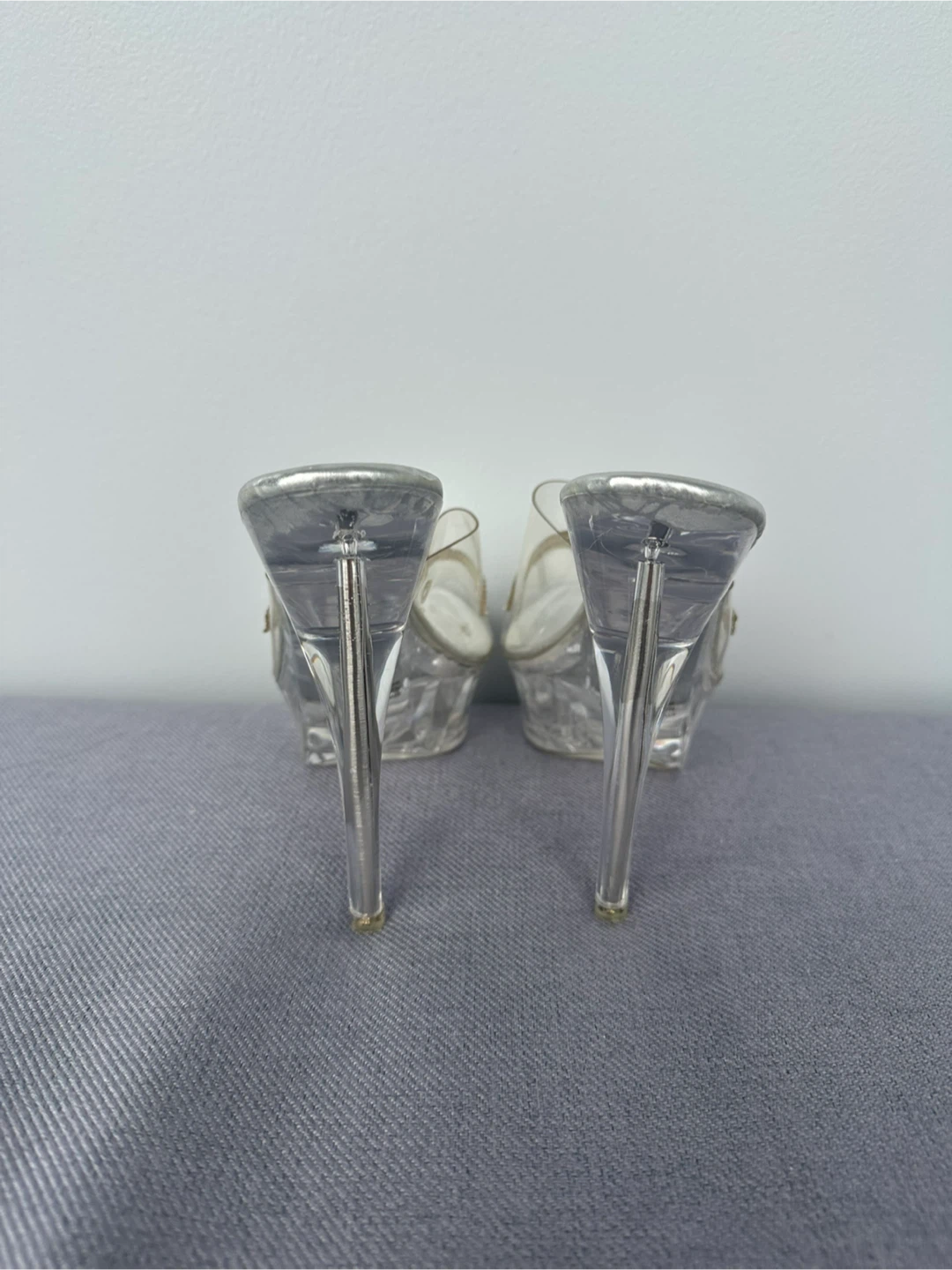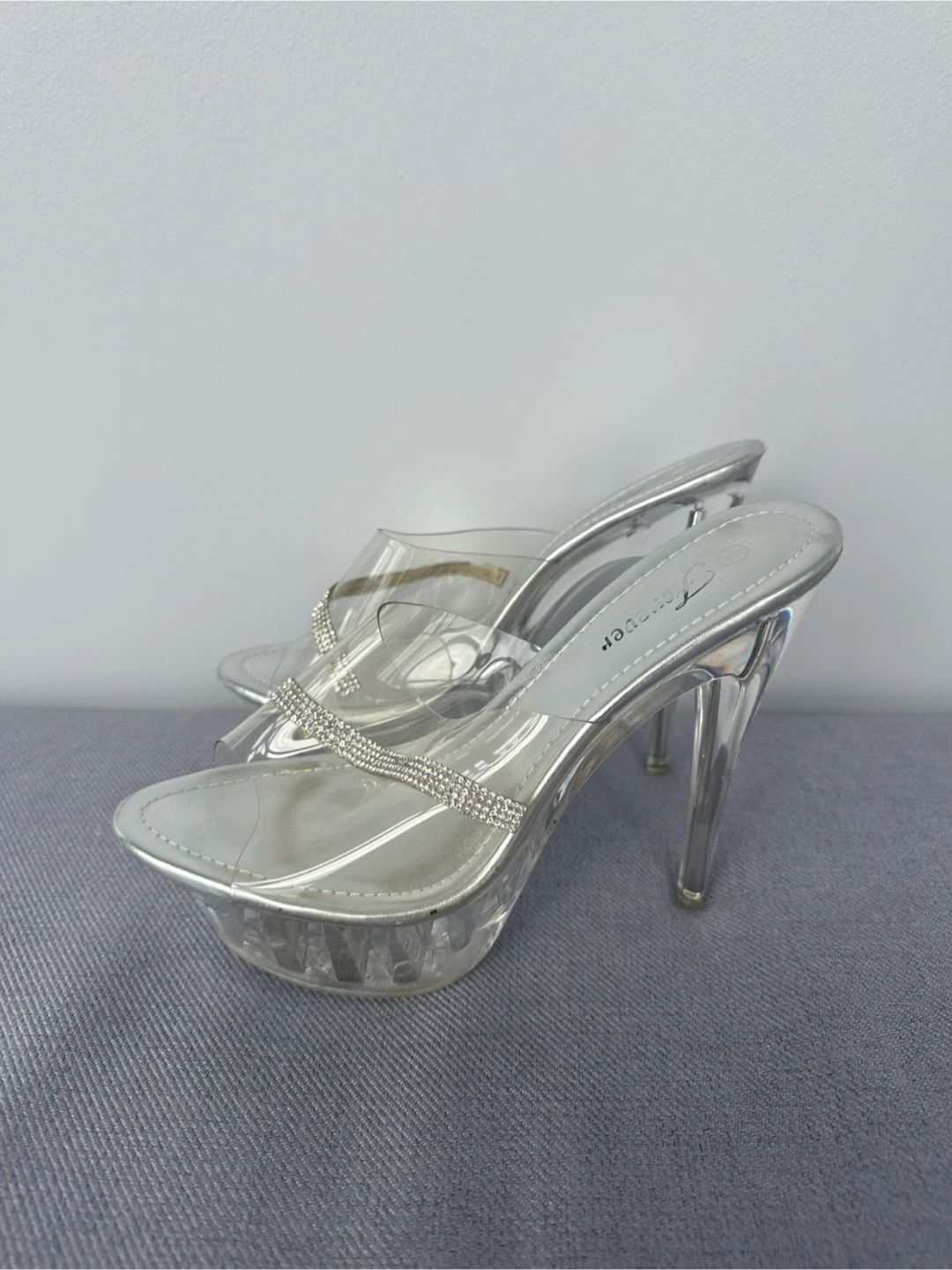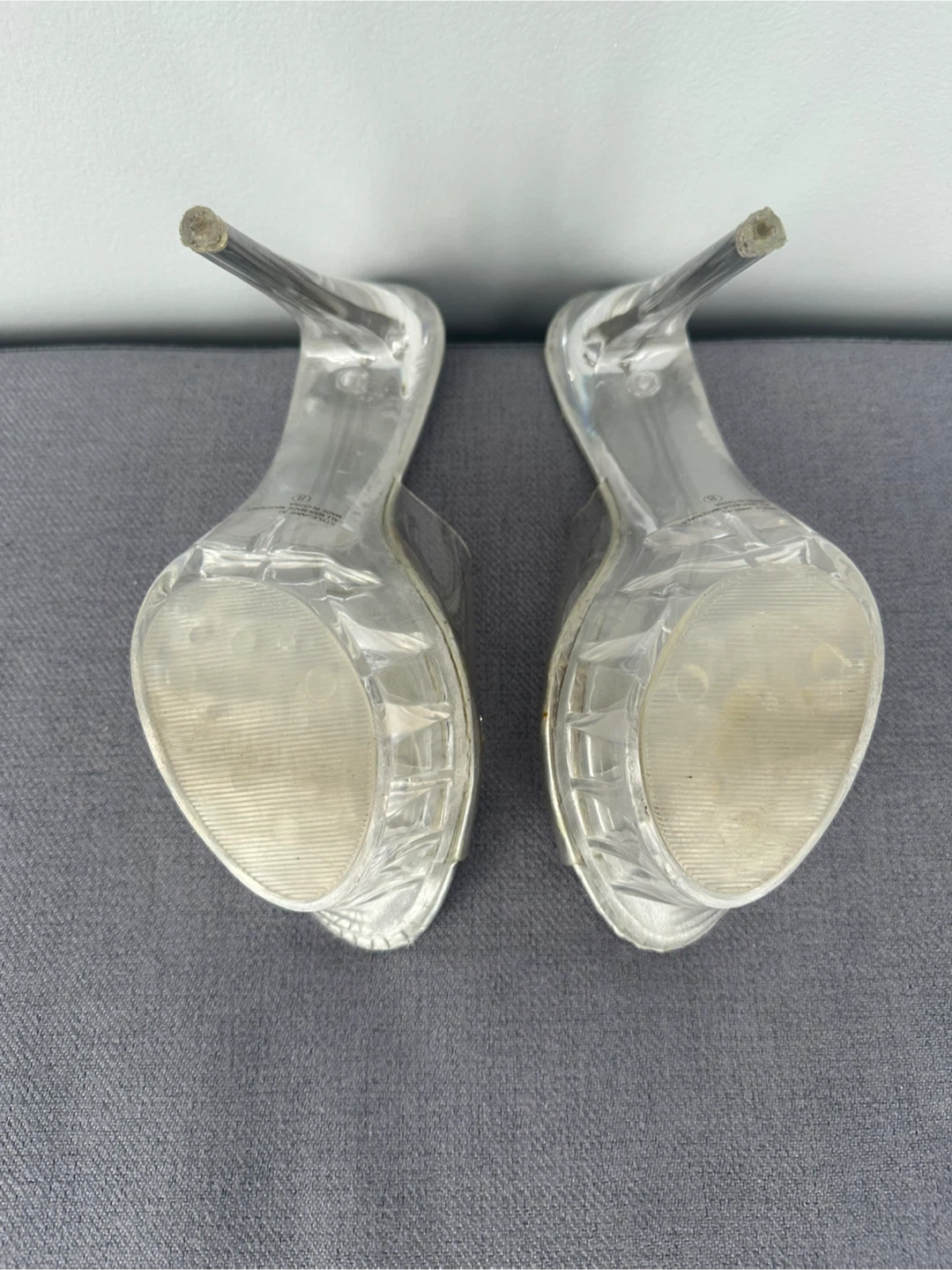 These are a pair of Forever brand platform heels, that are great to add height to your outfit. They're a clear, see-through material with a silver trim and rhinestone detailing. There are some rhinestones missing on the side of the right shoe. The platform makes them more comfortable to walk in. Size 8.