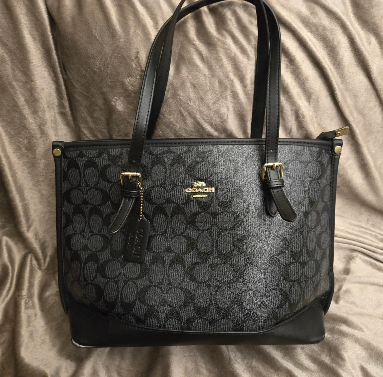 Selling a gently used tote bag in a black and grey signature pattern. It's a stylish and practical bag for everyday use. There's some slight wear on one of the bottom corners, but otherwise it's in great shape!