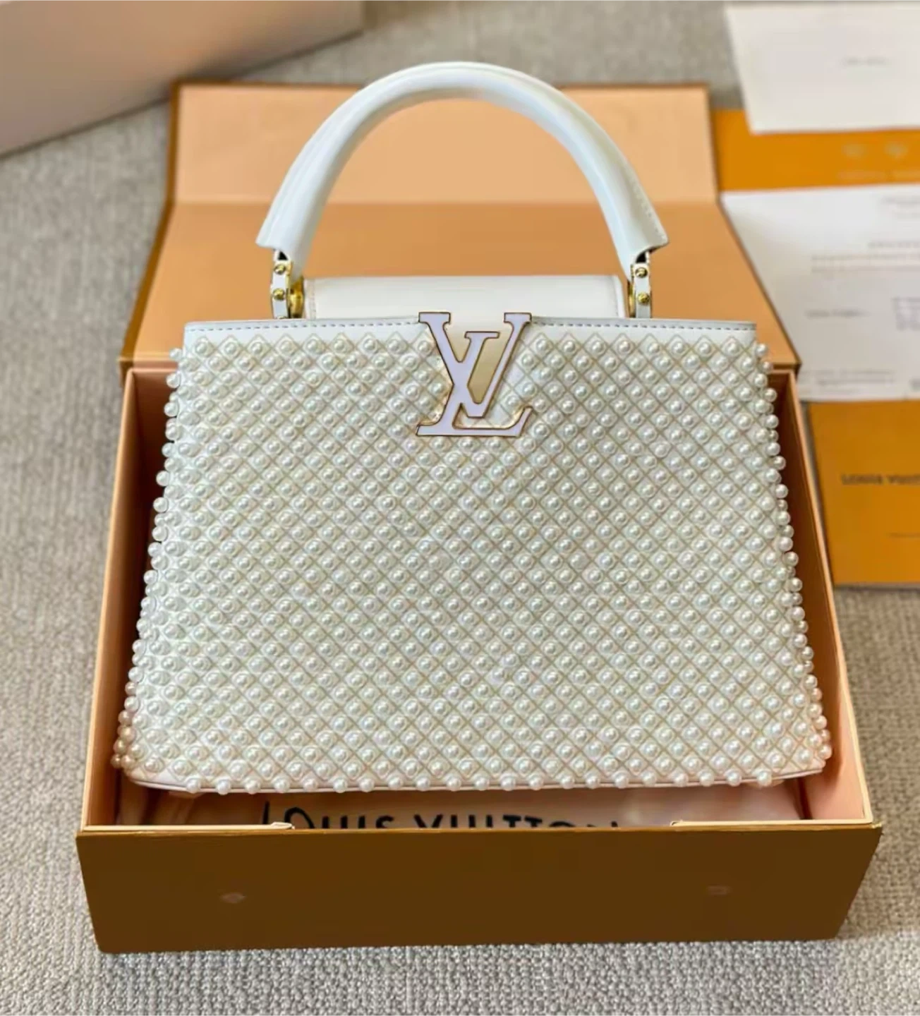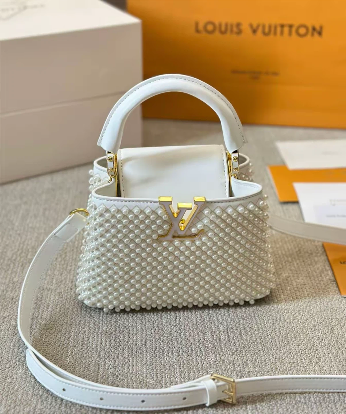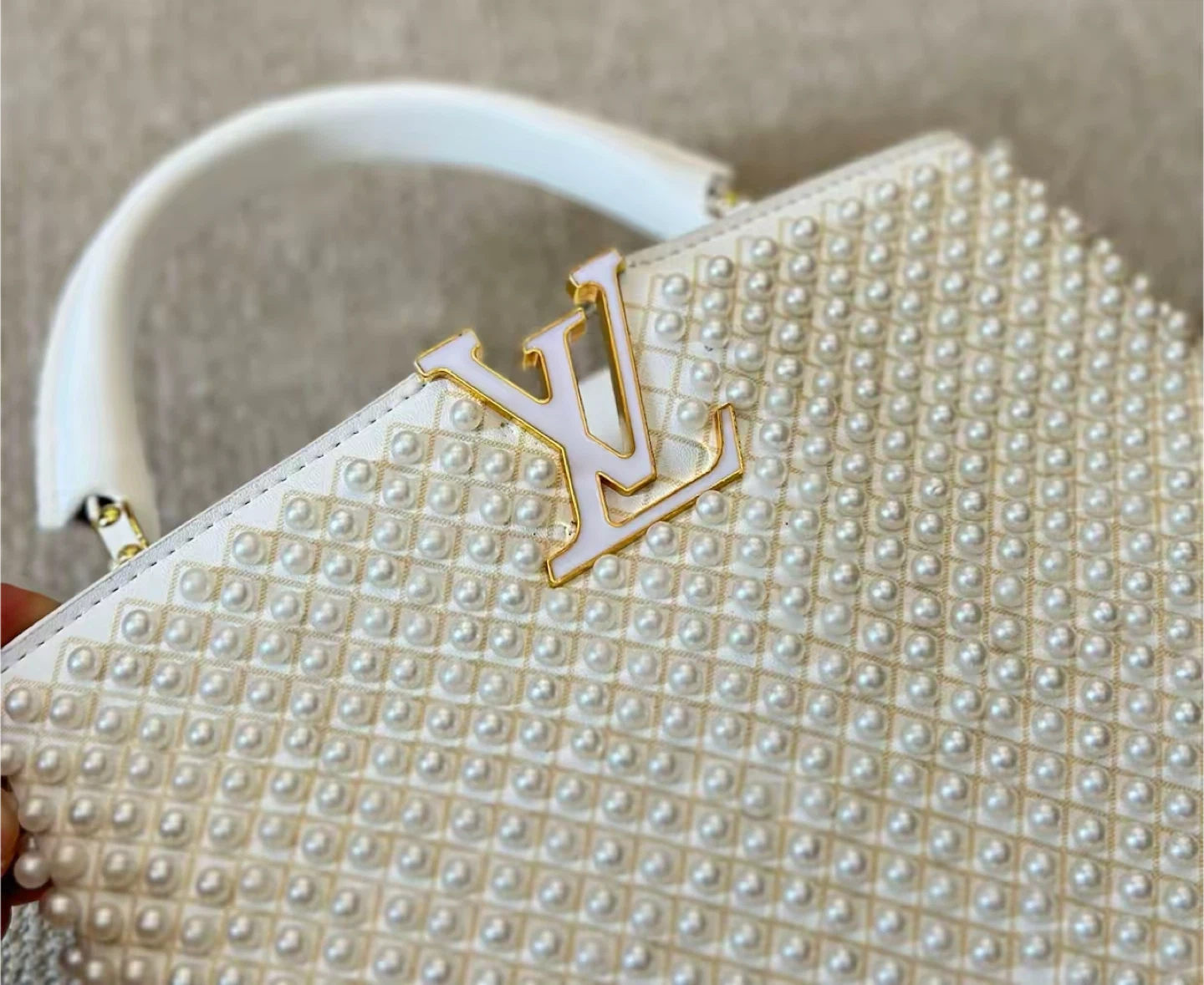 60This is a beautiful Louis Vuitton top handle bag, adorned with white pearls. It comes with its original box. A truly stunning piece!