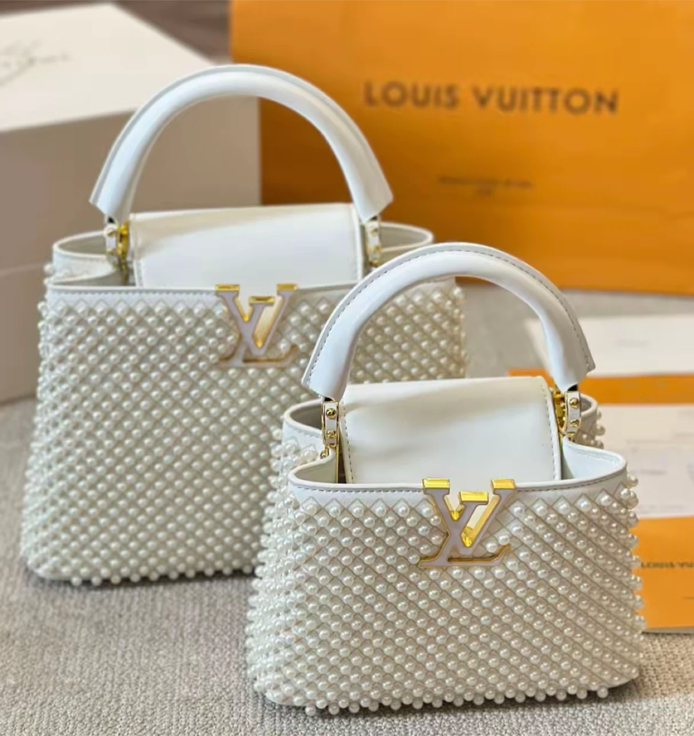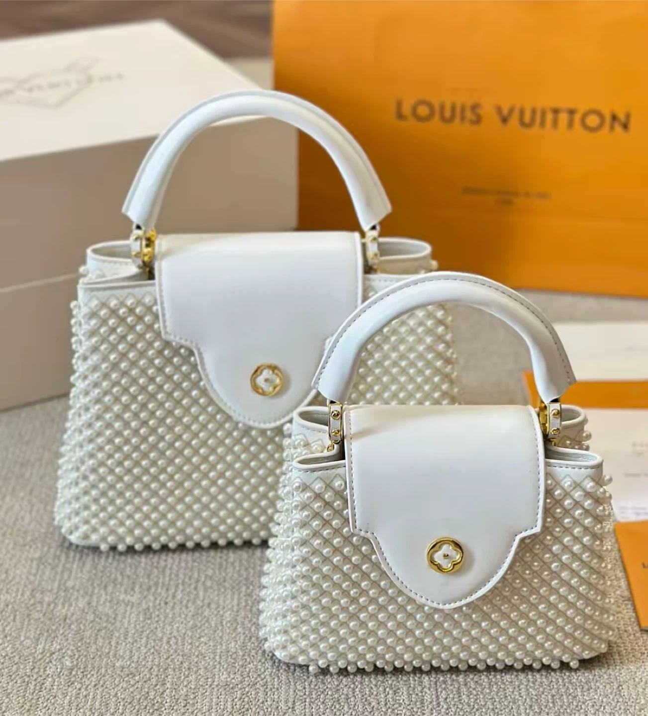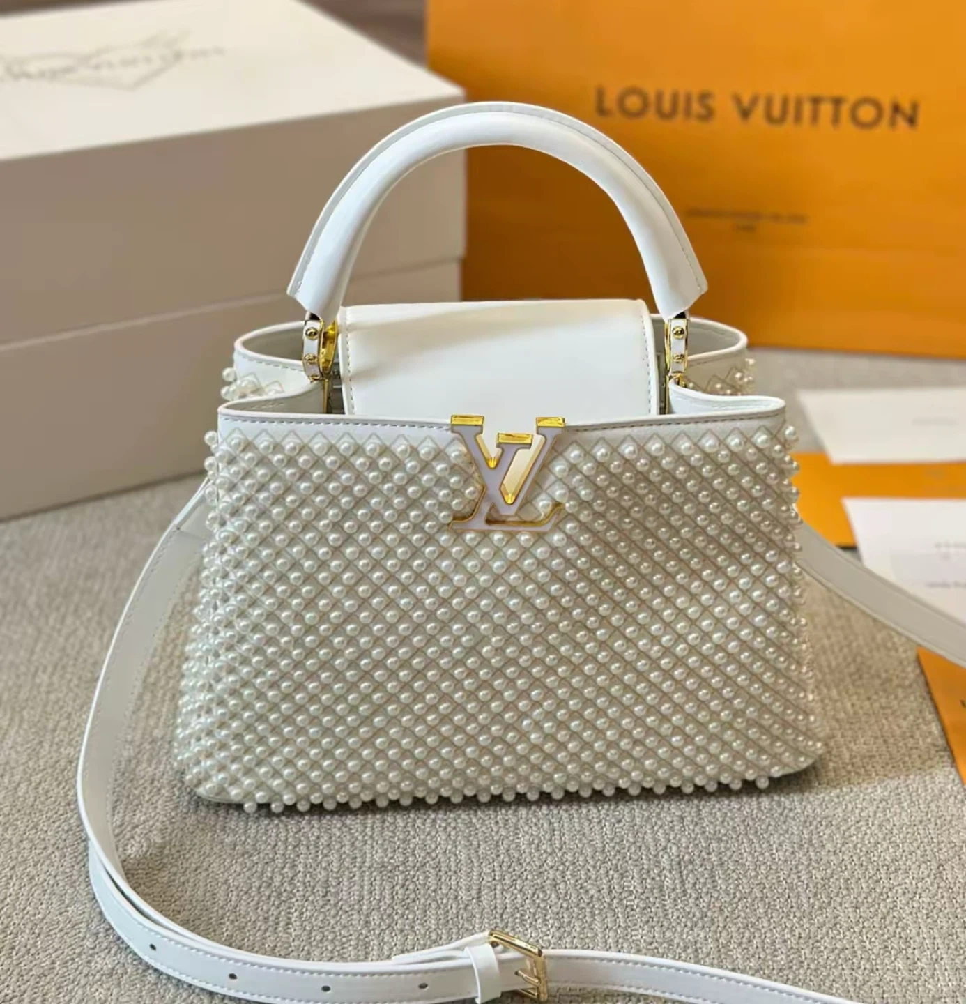 60This is a beautiful Louis Vuitton top handle bag, adorned with white pearls. It comes with its original box. A truly stunning piece!