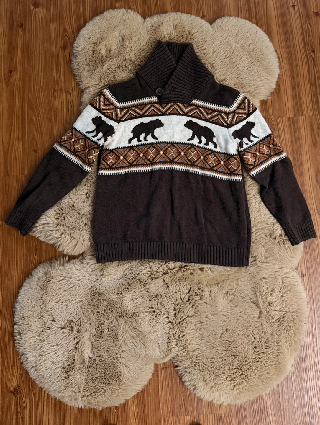 It's a brown knit with a unique collar and bear designs on the sleeves and chest. Perfect for staying warm and stylish during the colder months! Smoke free and pets free at home!