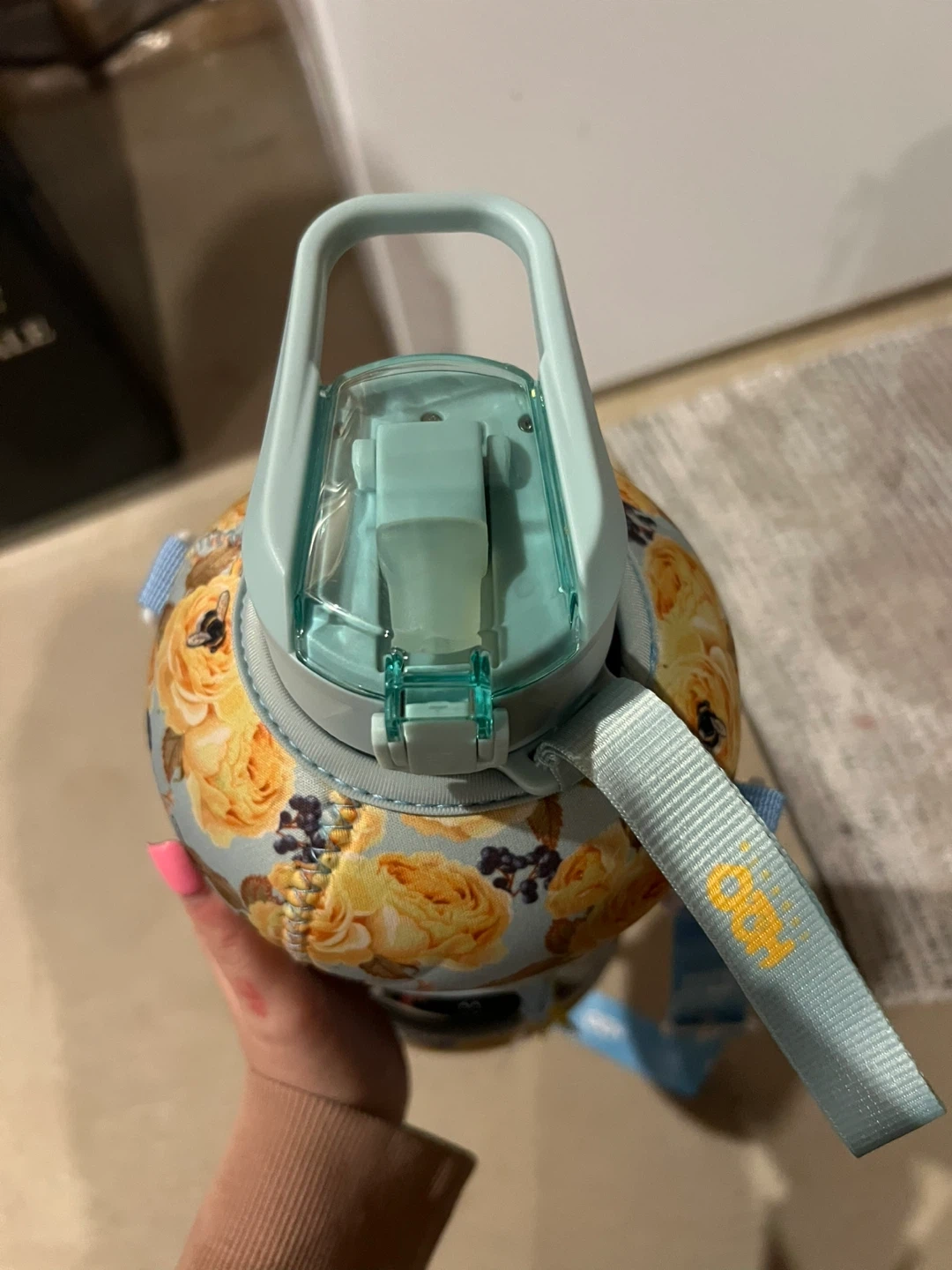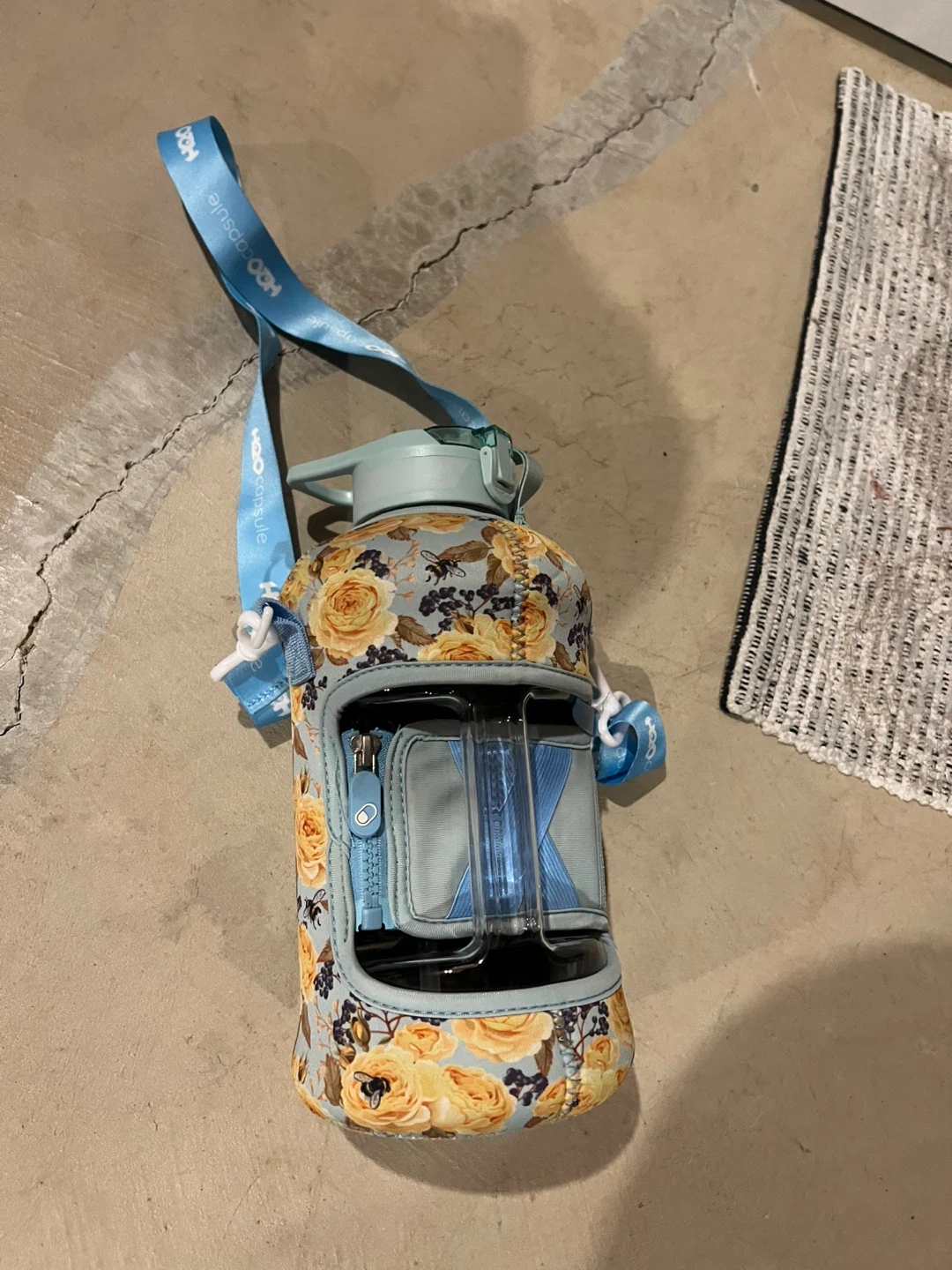 Selling a H2O Capsule water bottle. It has a pretty floral design on the sleeve and a convenient carrying strap. It's perfect for staying hydrated on the go!