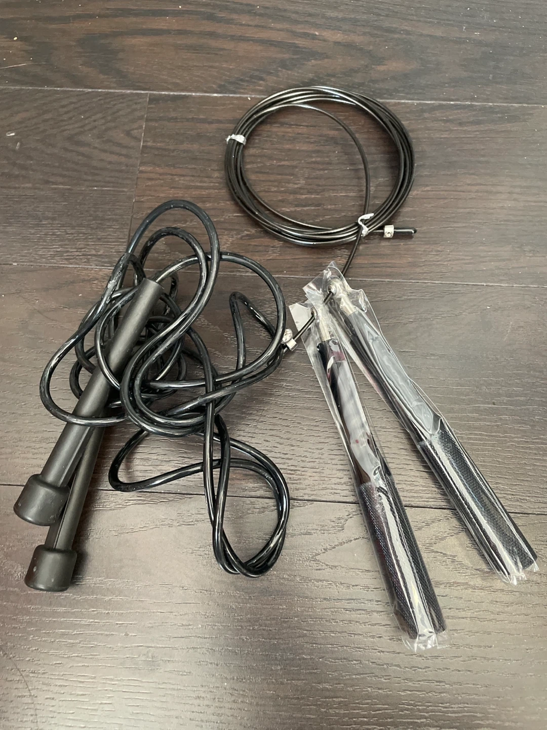 618Selling a set of jump ropes. One is a standard black jump rope, and the other is a sleek, adjustable speed rope still in its packaging. Perfect for workouts!