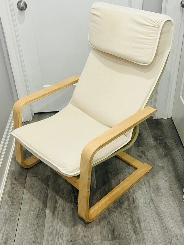 Sink into relaxation with this gently sloping Ikea Poang chair, complete with a comfortable headrest and natural wood frame. This chair has been lightly enjoyed and is in good condition, perfect for adding a touch of Scandinavian comfort to your home. If you've been searching for a comfy spot to read or unwind, this is it! And just so you know—if the ad is up, the chair is still available, ready to bring relaxation to your space! Small wear and tear on the backside