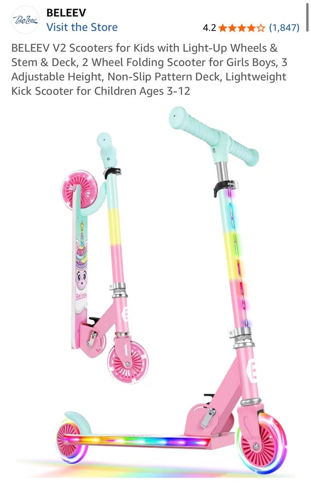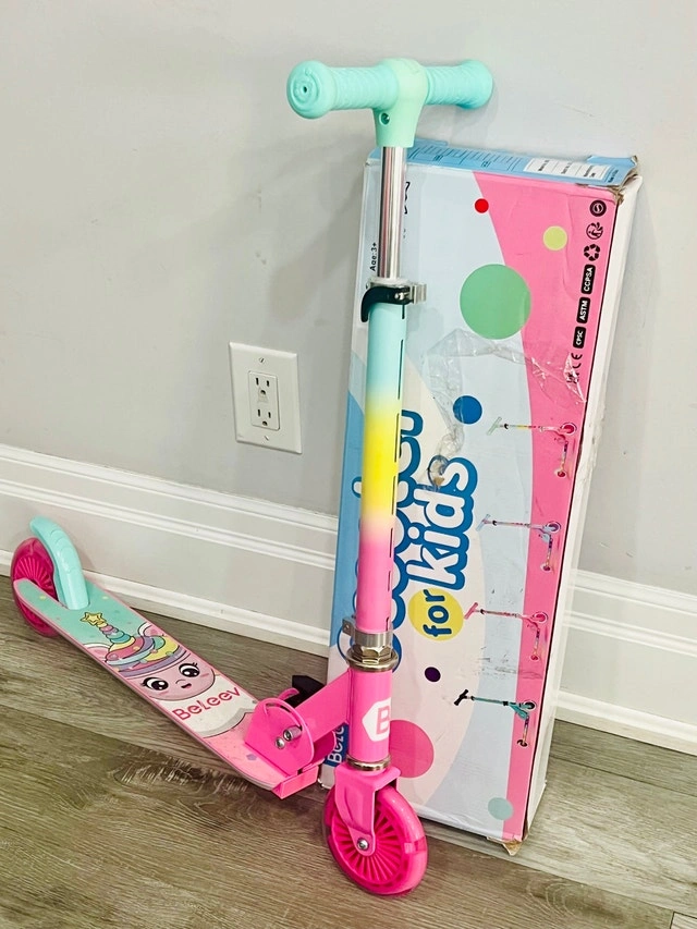 Get ready to roll with this Beleev V2 scooter! It's pink, features LED light-up wheels and stem, and has an adjustable height, perfect for kids ages 3-12. While it's been enjoyed, it's still in great shape for more fun adventures. Here are some features: * LED Light-Up Wheels * Adjustable Height * Non-Slip Pattern Deck * Lightweight and foldable Just a friendly reminder, if you're seeing this ad, it's still available!