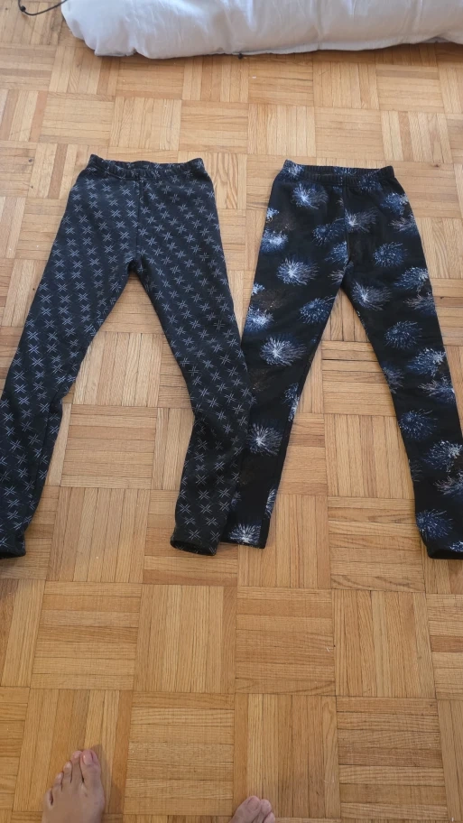 19Selling two pairs of leggings. One pair has a black background with white star-like shapes, and the other has a black background with blue and white firework-like shapes. Both are in great condition!