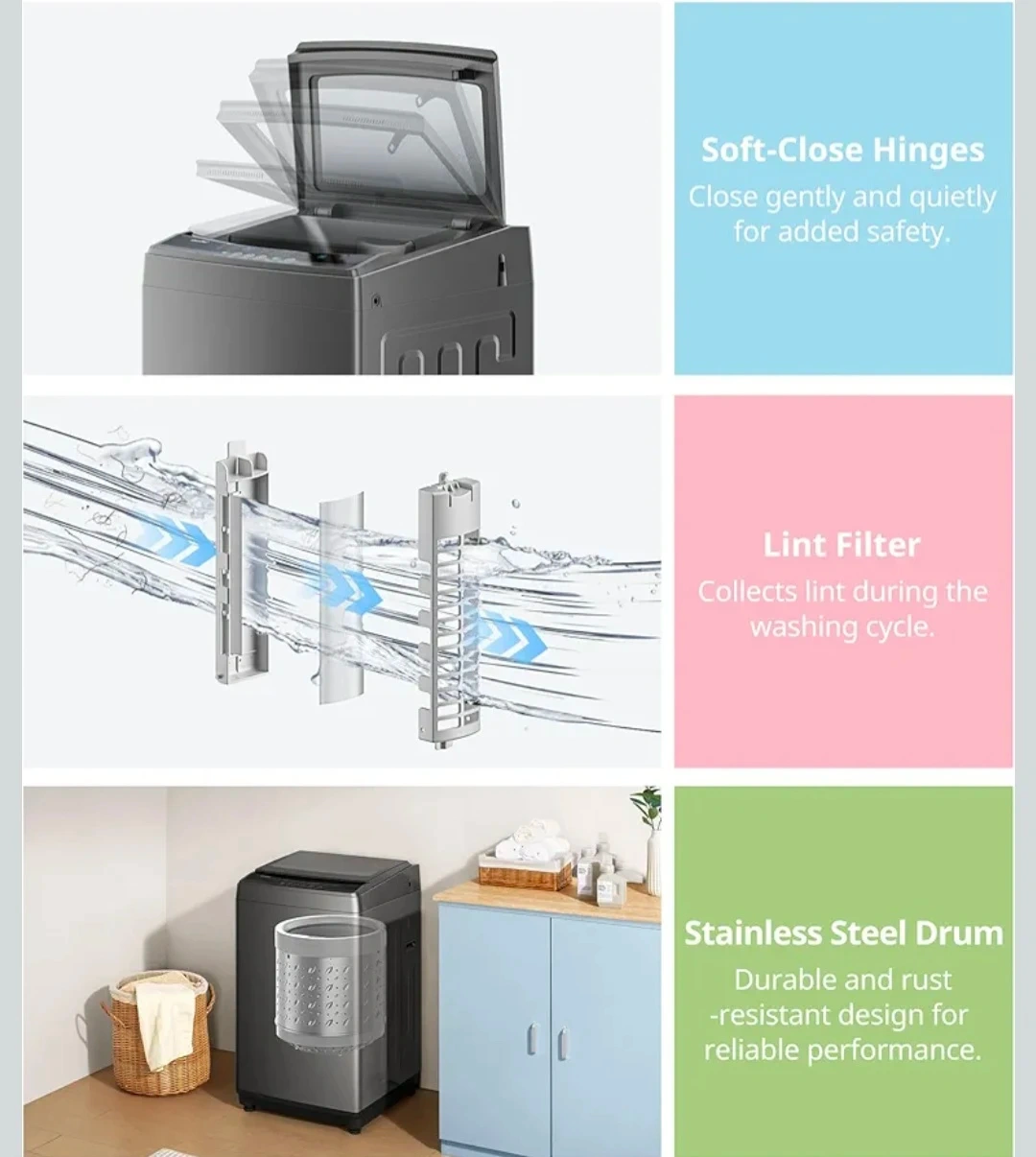 The large capacity of 1.6cu.ft top load washer can hold 11lbs (5kg) of cloth. It is equipped with a stainless steel inner tub which lasts longer.
