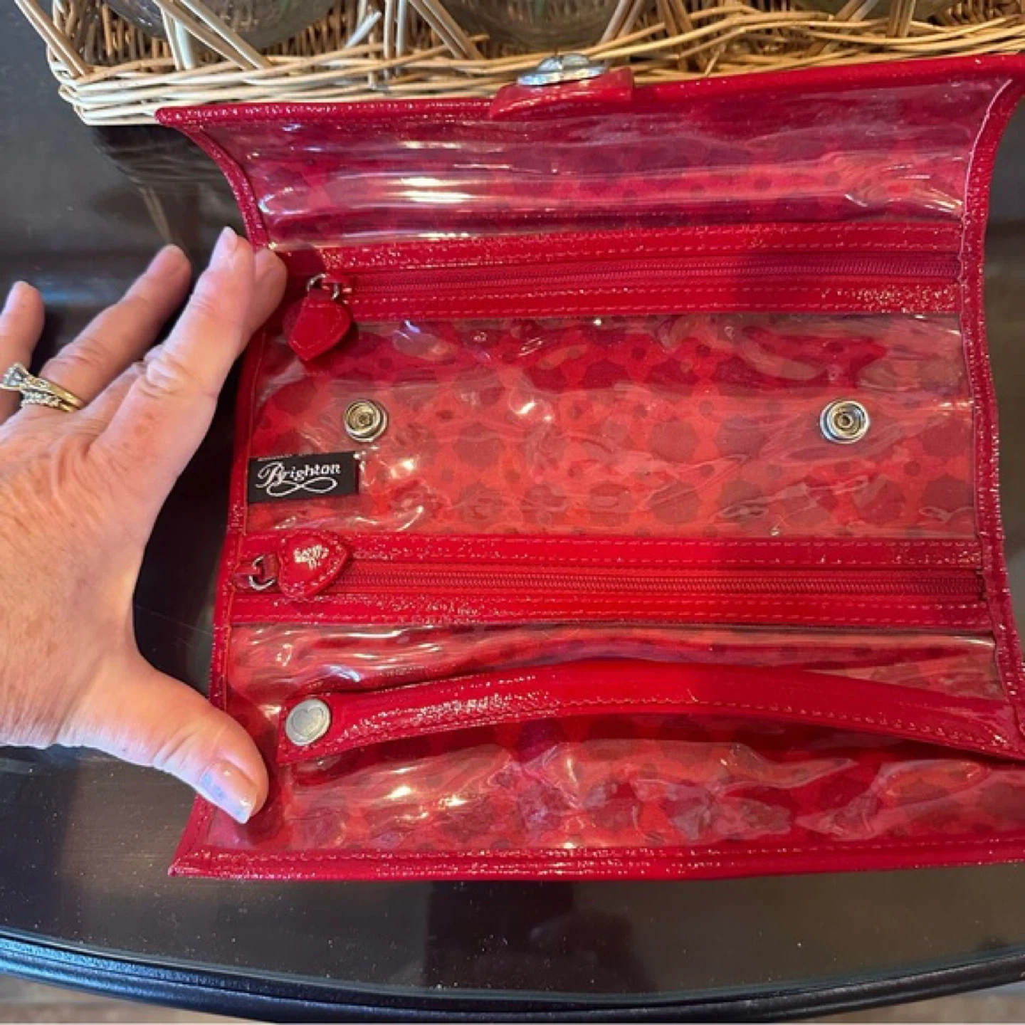This Brighton jewelry roll features a striking zebra stripe pattern with red accents. It's perfect for keeping your jewelry organized while you're on the go. I bought this for $115.69.