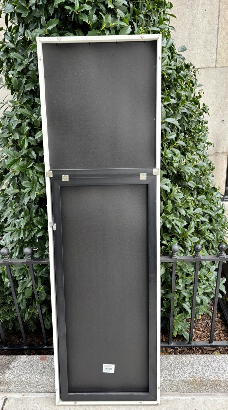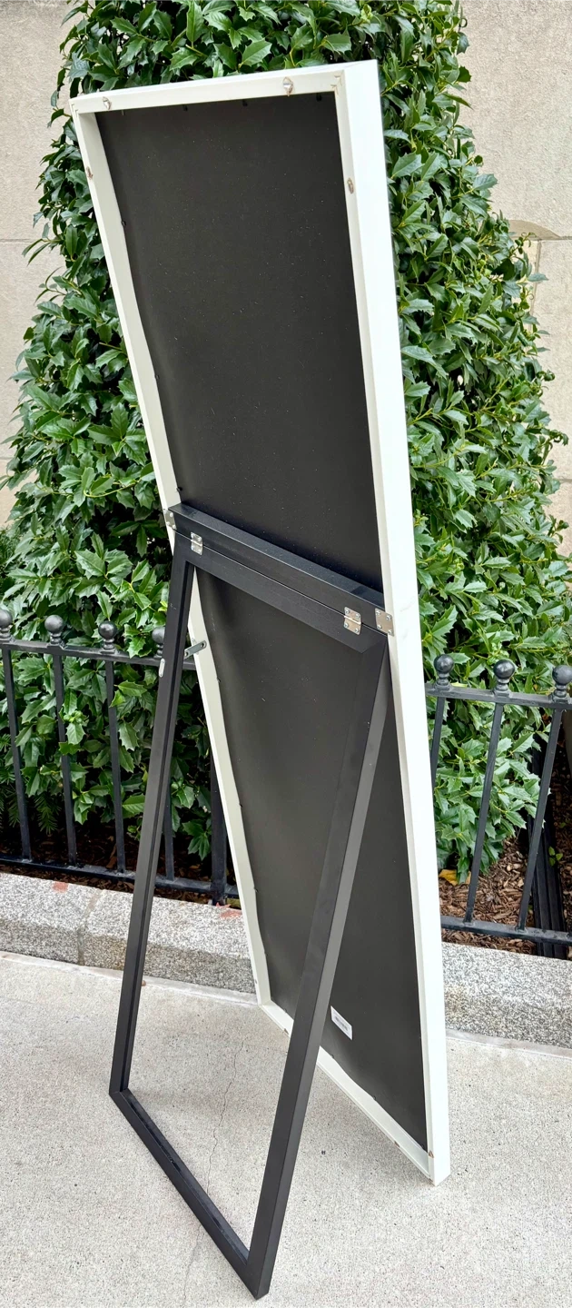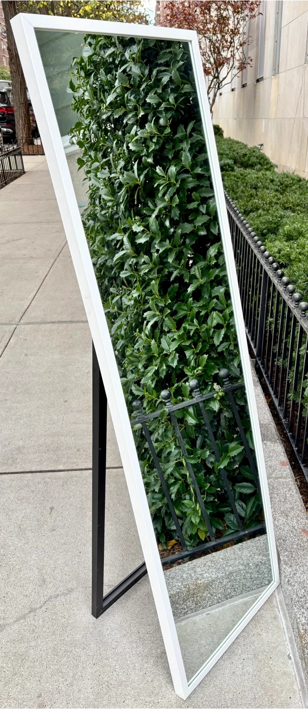 Free standing mirror with a white frame. It's in great condition and ready to brighten up your space! The mirror has a black stand on the back.