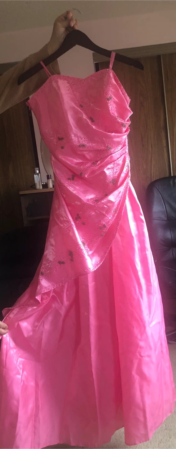 Once tried a beautiful pink formal dress! It's in great condition and ready for a new home. The dress features a unique design with beaded accents. It would be perfect for prom or any special occasion!