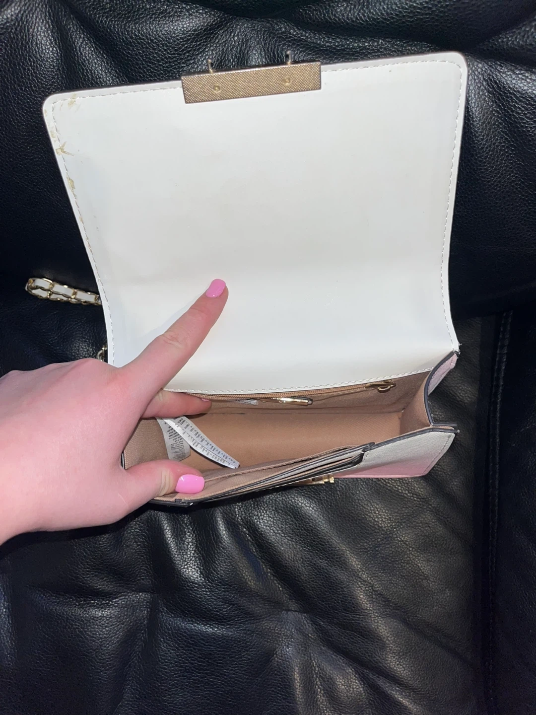 Cute Aldo crossbody bag in a pink and white ombre colour. It has a gold chain strap and butterfly details on the front. Perfect for adding a touch of sparkle to your outfit!