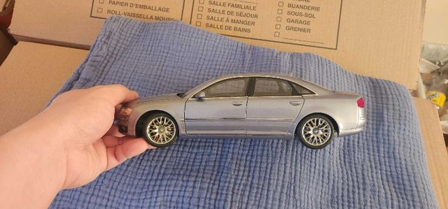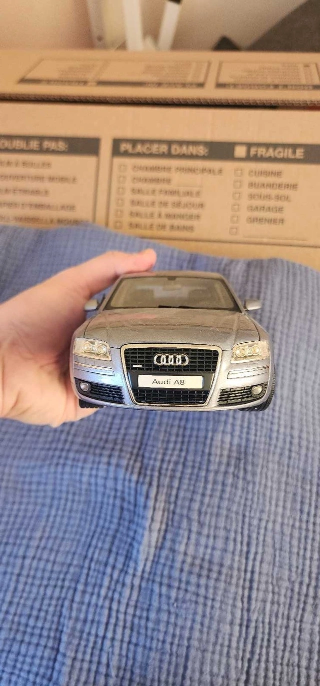 I'm offering a 1/18 scale Kyosho Audi A8 model car. This detailed diecast replica features a silver finish and intricate interior. It is in used condition, doors open and close, and the wheels move freely. A great addition to any model car collection!