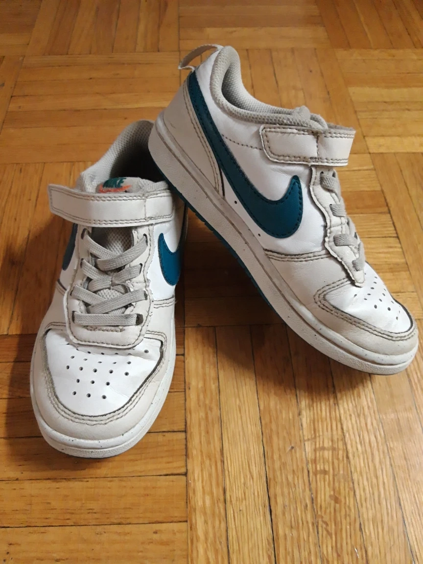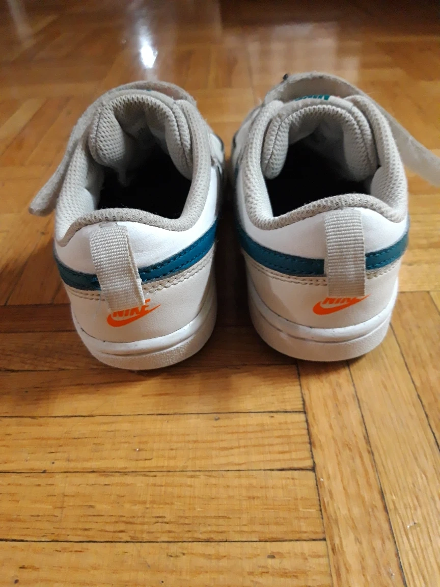 These are a pair of Nike Court Borough Low 2 shoes for kids. They are white with a teal swoosh and orange accents. They have laces and a velcro strap. They show some signs of wear, but still have lots of life left!