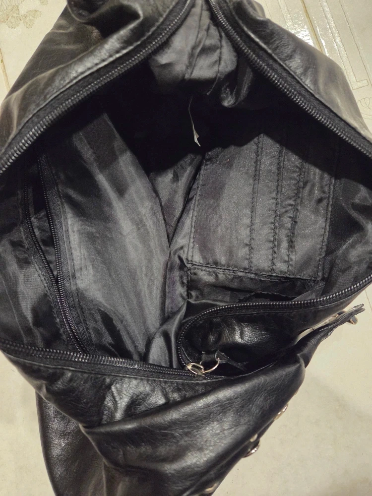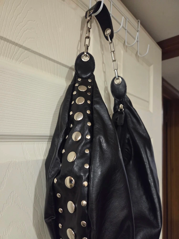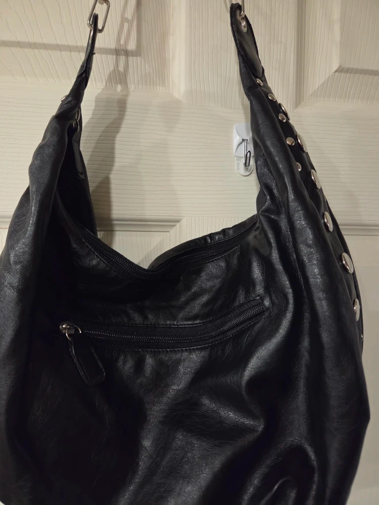 Stylish black shoulder bag with silver stud detailing! This bag is perfect for everyday use and has plenty of room for all your essentials. The interior is lined and features multiple pockets for organization. It's in great condition and ready for a new home