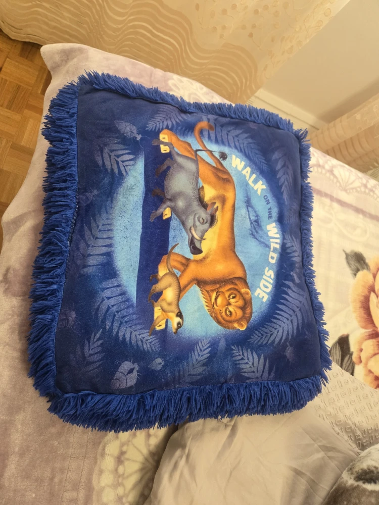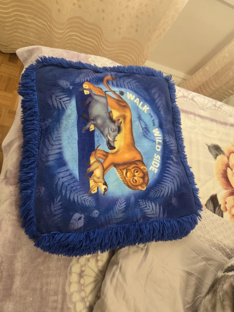 Lion King themed throw pillow! One side has the Lion King characters and the other side is a fluffy blue material