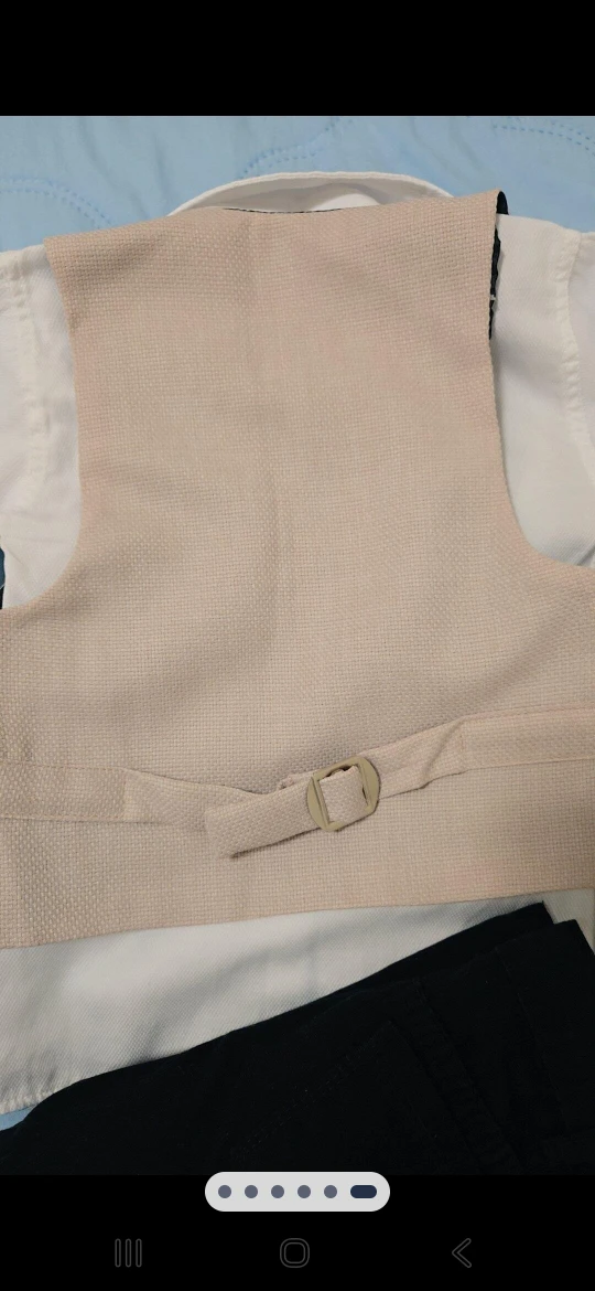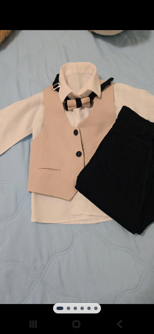 Selling a toddler boy's casual suit, perfect for ages 3-5 years! It's in like-new condition and includes a shirt, vest, bow tie, and pants. A great outfit for any special occasion!