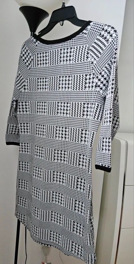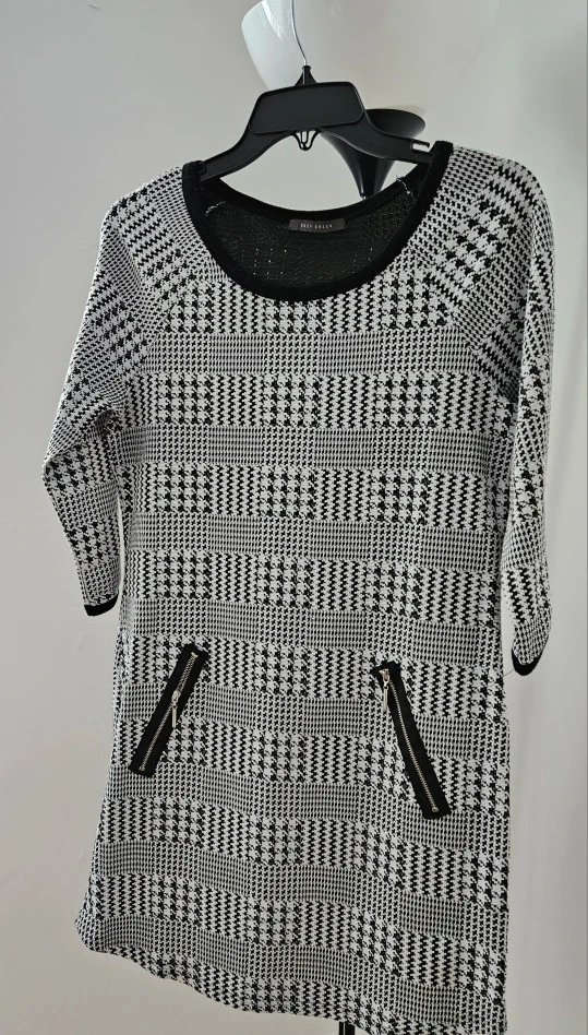 This Sonia Rykiel dress features a stylish black and white pattern. It has a comfortable fit and a unique design with zippered pockets. Perfect for any occasion!