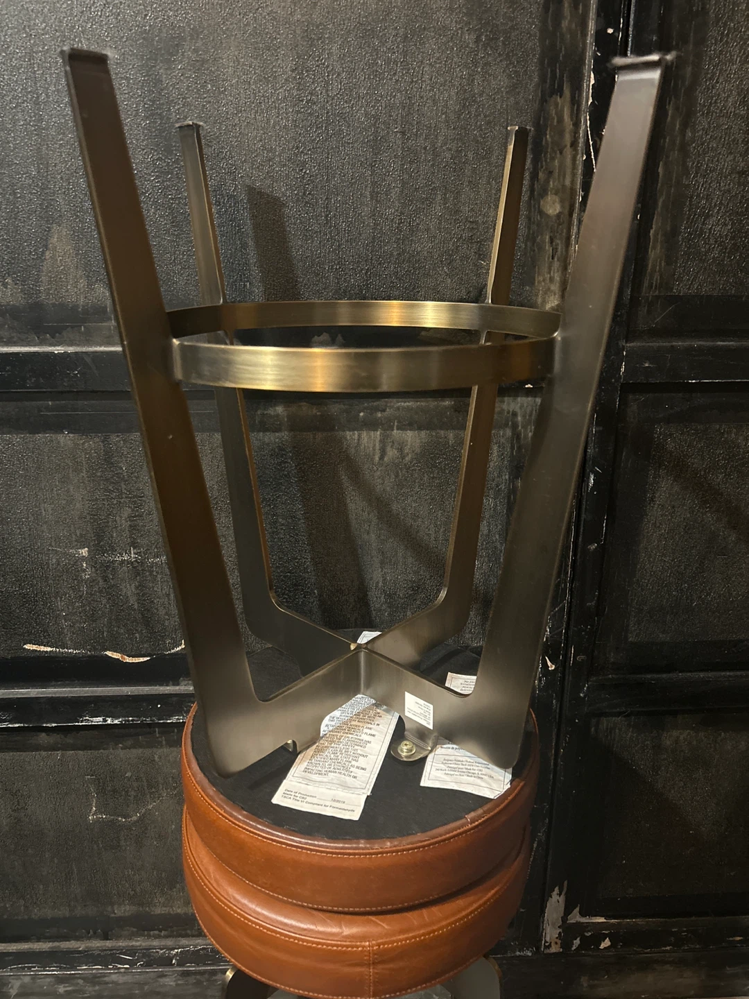 Construction: Frame:steel brass powder coated with high gloss lacquer buffalo leather -brown - non fr foam. Seat height is 30" to sit at bar height table.