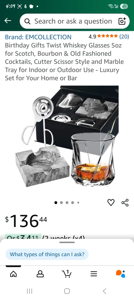 Selling a brand new EM Collection whiskey glasses set! It comes with everything you need for the perfect drink. The set includes twist whiskey glasses, a cutter scissor style, and a marble tray. Still in its original packaging!