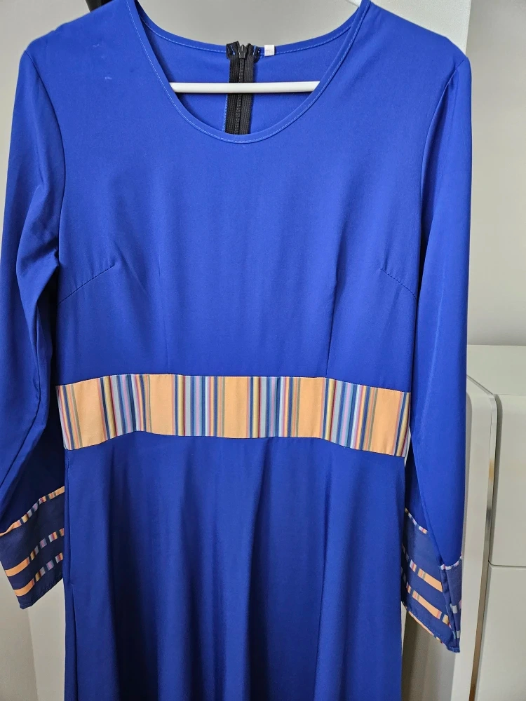 Here's a lovely blue long-sleeve dress! It's a size XL and features a unique striped design around the waist and cuffs. Perfect for adding a pop of colour to your wardrobe