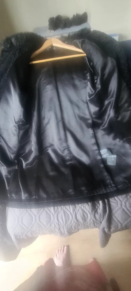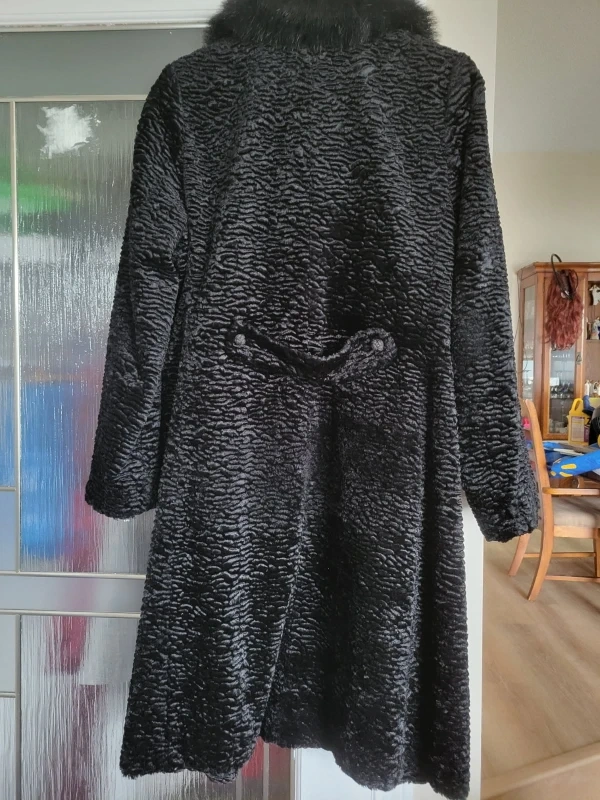 Simon Chang, gorgeous black winter coat for women. Only worn 6 times. Is clean. Inside and outside buttons. Button at the neck. Faux fur collar. This is a warm coat! Size 9/10. Pit to Pit is 17". Shoulder to shoulder is 16". Shoulder to bottom hem is 40". Pit to end of sleeve is 17". I paid $180.00. Selling for $50.00.
