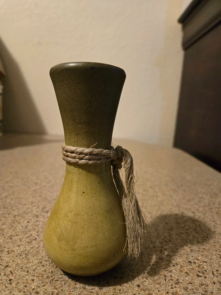 A cute decorative vase, perfect for adding a touch of rustic charm to your home! It features a unique shape and a rope detail around the neck.