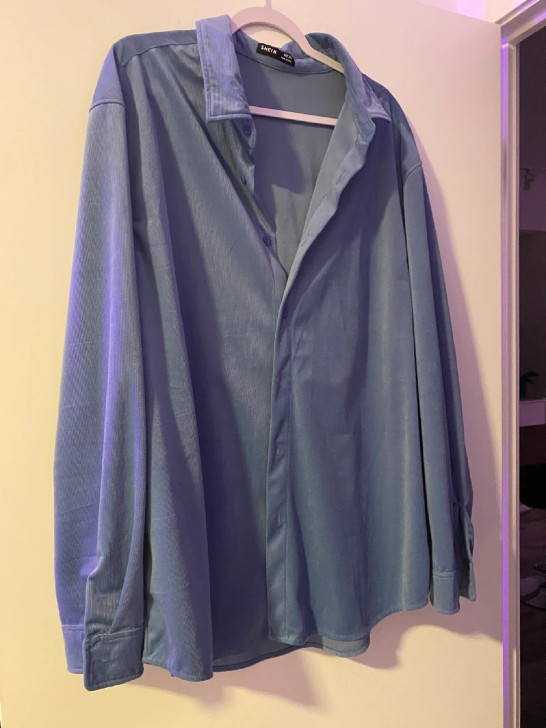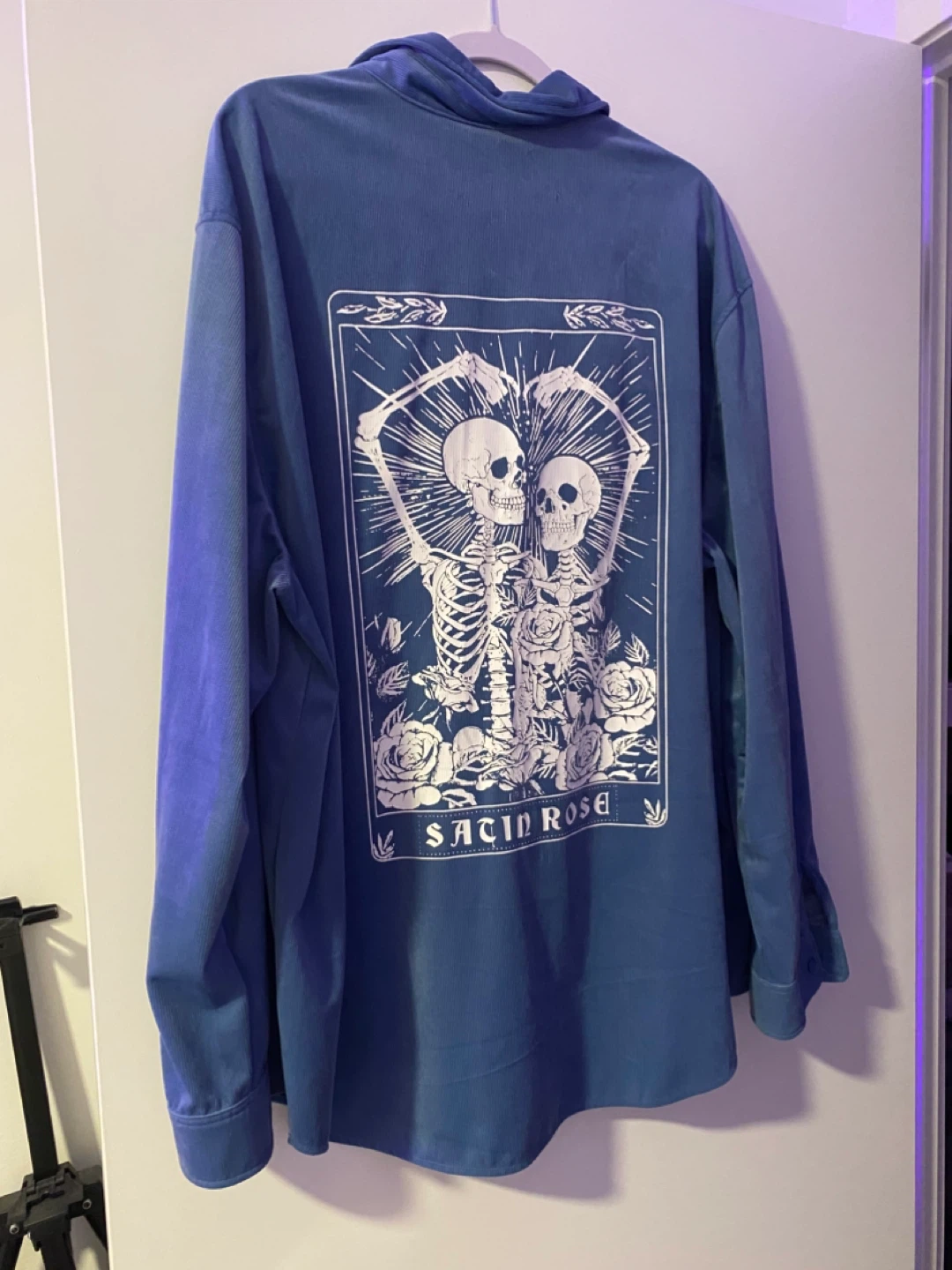 Selling a Shein Rose skeleton shirt in size 2XL! It's a button-up style with a cool skeleton and rose graphic on the back. The material has a nice corduroy texture and it's in great condition!