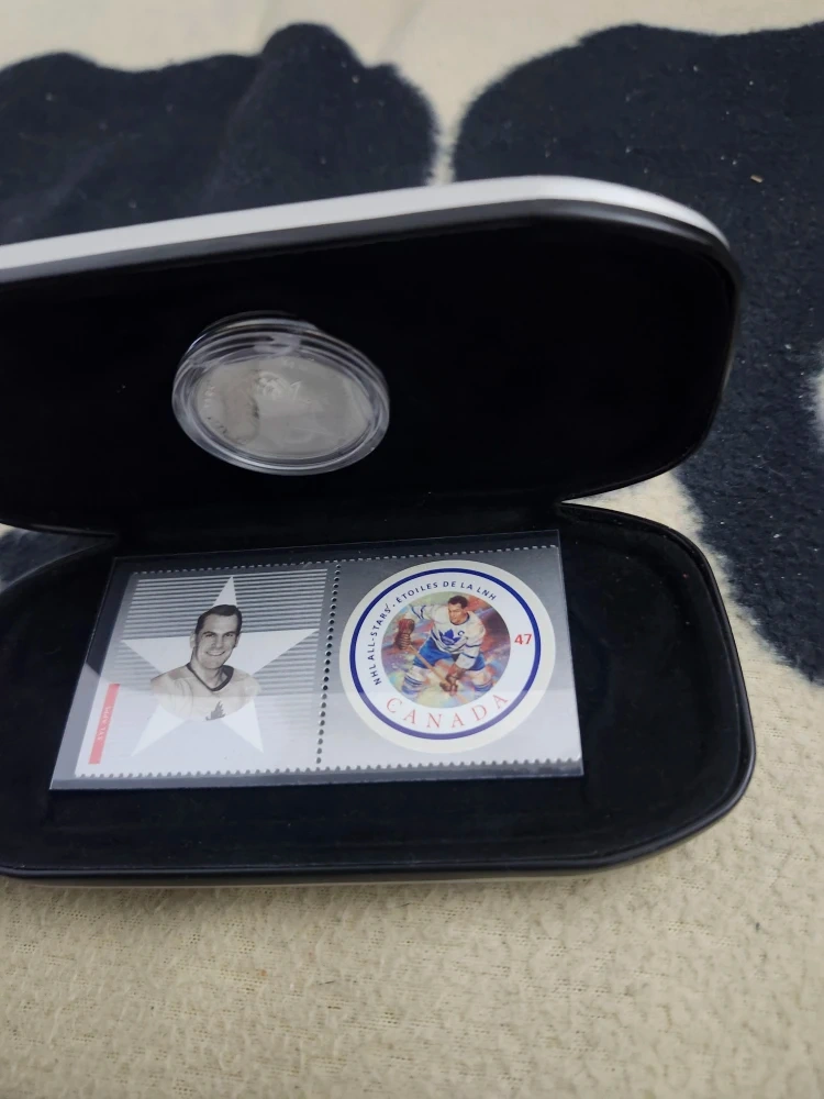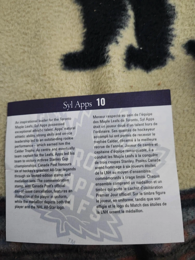 Selling a commemorative stamp and medallion set featuring Syl Apps, an inspirational leader for the Toronto Maple Leafs. The set includes a commemorative stamp with Canada Post's official day-of-issue cancellation, featuring an illustration of the player in uniform. The medallion depicts both the player and the NHL All-Star logo