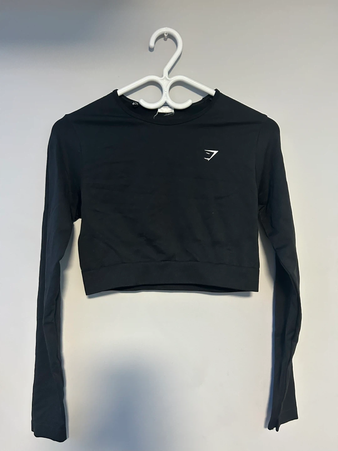 Here's a Gymshark long sleeve crop top in black. It's perfect for workouts or casual wear. The material is comfortable and flexible, making it great for any activity. Feel free to ask any questions!