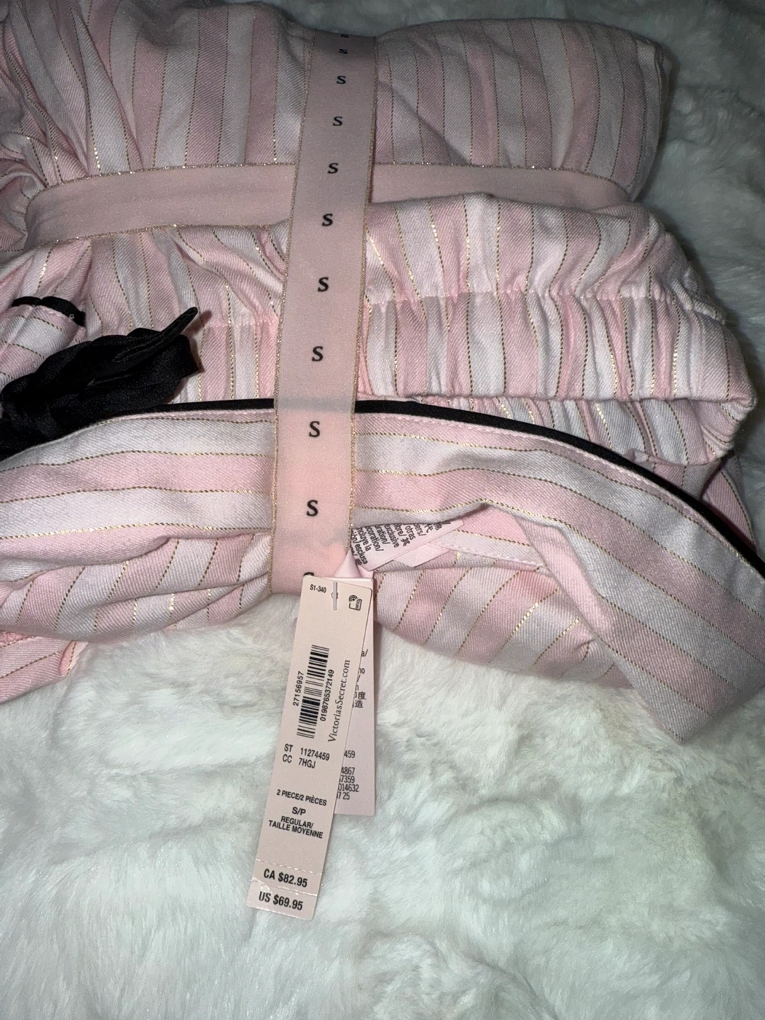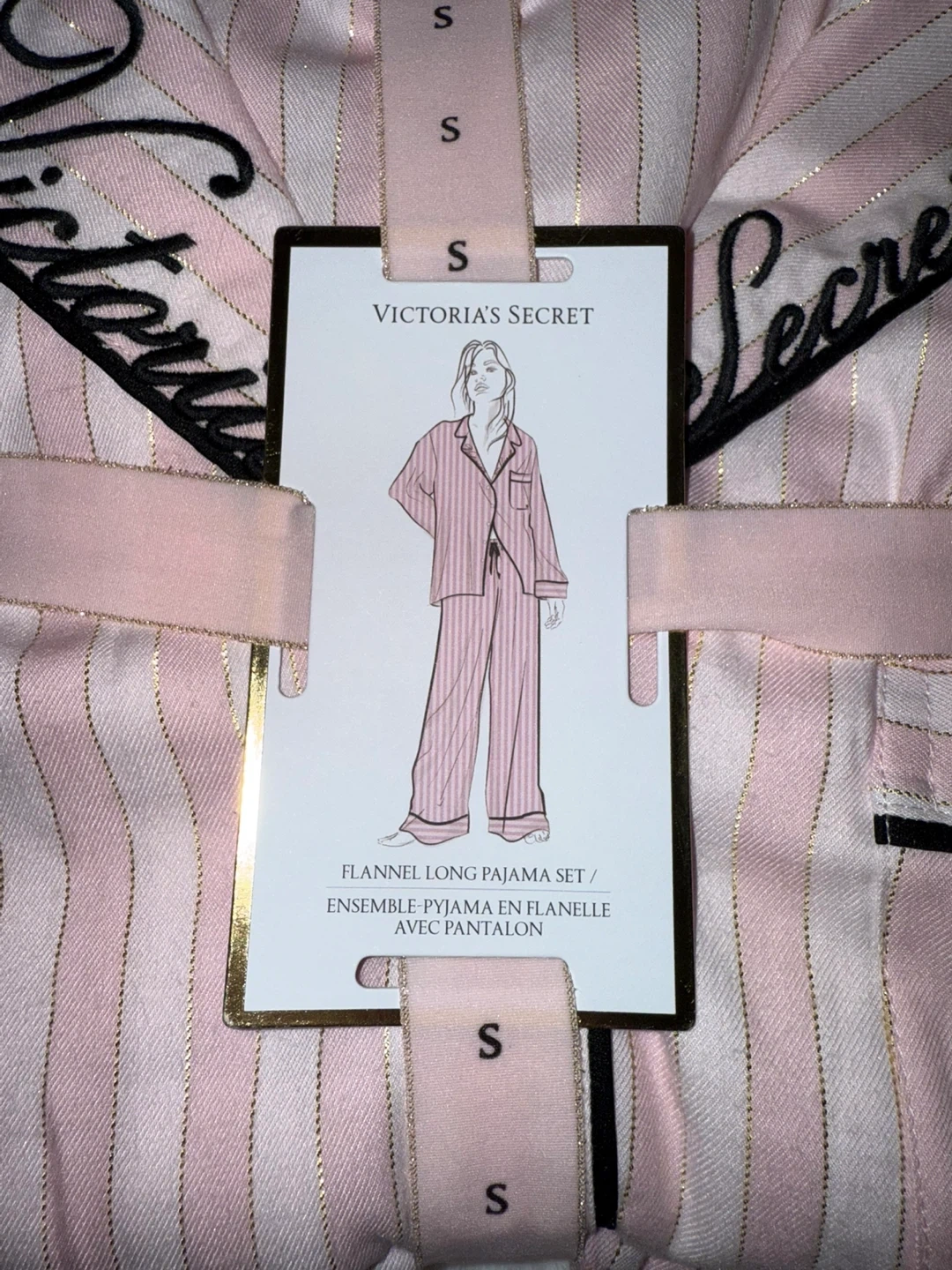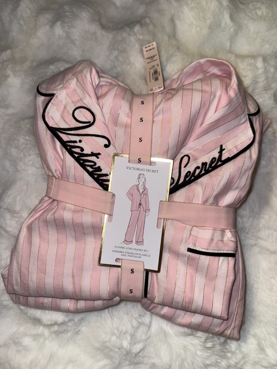Selling a brand new Victoria's Secret Flannel Long Pajama Set in size small! This adorable set features a pink and white striped pattern with gold accents. Bought it recently for $82.95 CAD. Plus tax. Perfect for cozy nights!