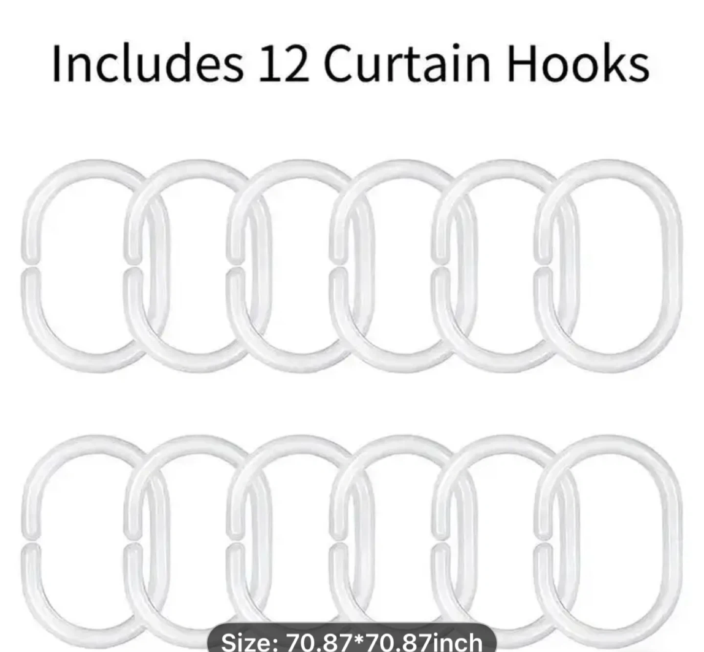Selling a large-sized shower curtain that comes with 12 curtain hooks! The dimensions are 71 inches in width and 74 inches in height. The colour is polychrome, adding a nice touch to any bathroom.