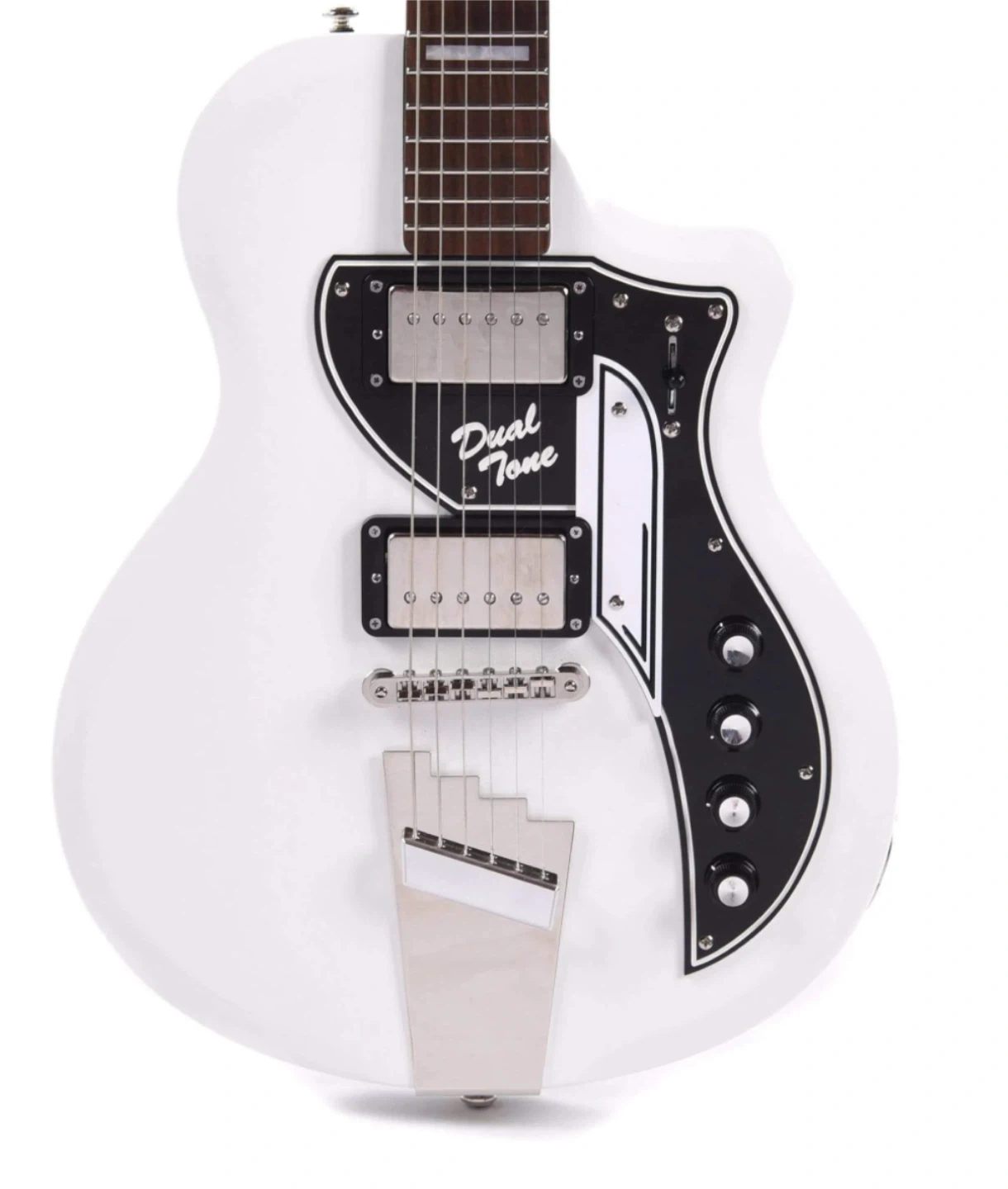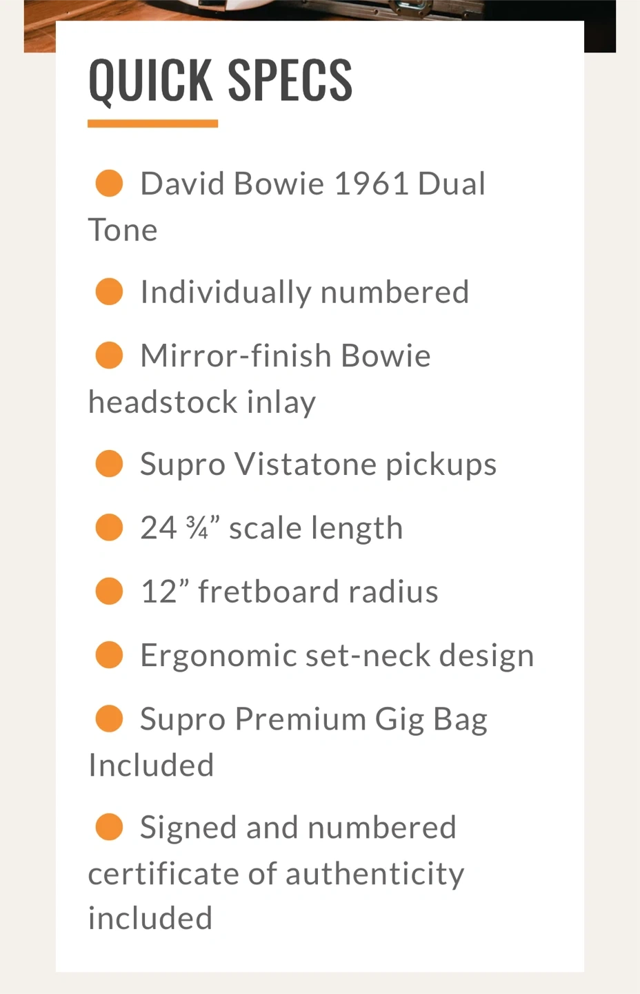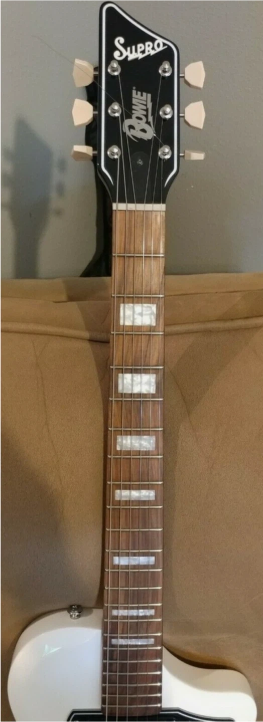 Selling a Supro David Bowie 1961 Dual Tone guitar! Here are some quick specs: - Individually numbered - Mirror-finish Bowie headstock inlay - Supro Vistatone pickups - 24 3/4" scale length - 12" fretboard radius - Ergonomic set-neck design - Supro Premium Gig Bag Included - Signed and numbered certificate of authenticity included