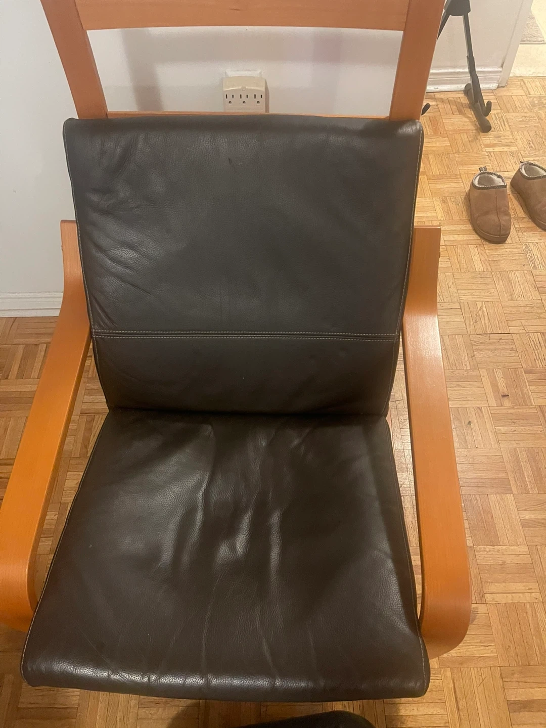 Selling a comfortable leather office chair in brown! It's in good condition and perfect for your home office or workspace. The chair has a sturdy wooden frame and a sleek leather seat and backrest. It's a great addition to any room! NOTE clean and comfortable genuine leather seat thanks