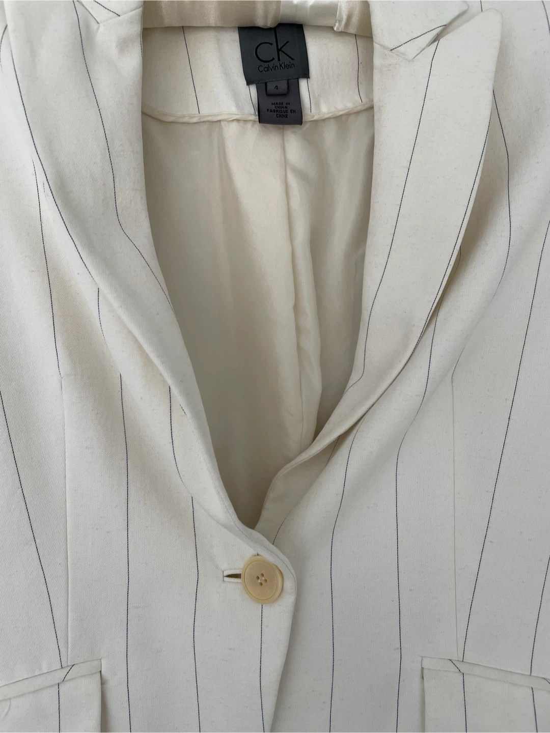 Selling a Calvin Klein blazer in a lovely white with subtle pinstripes. It's a size 4 and in great condition. Perfect for adding a touch of sophistication to any outfit