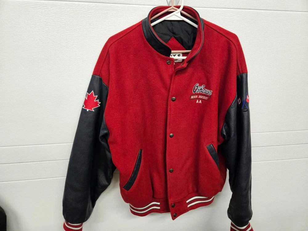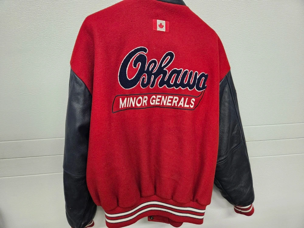 Selling a Roy's Enterprise Ontario hockey jacket. It's in great condition and perfect for any hockey fan! The jacket features the Oshawa Minor Generals logo on the back and Canadian flags on the sleeve. Size L/G.