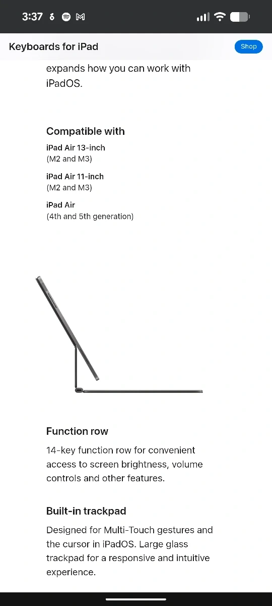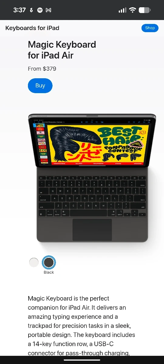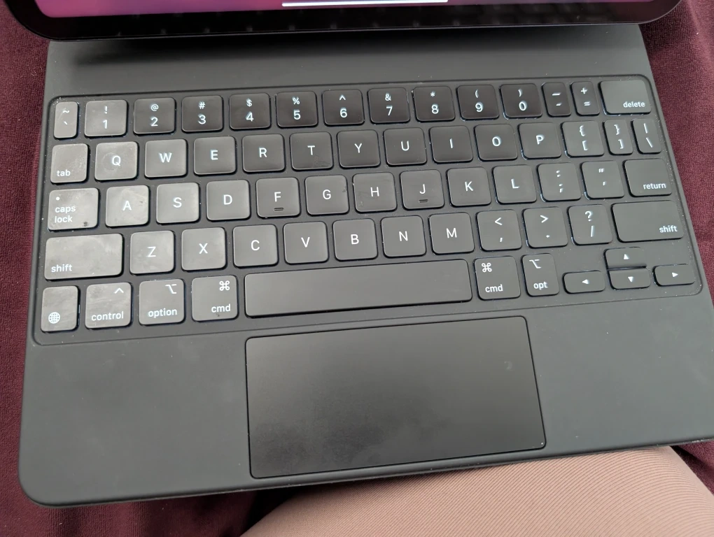 Selling an Apple Magic Keyboard for iPad Air in black. It is the perfect companion for your iPad Air, delivering an amazing typing experience and a trackpad for precision tasks. The keyboard includes a 14-key function row and a USB-C connector for pass-through charging