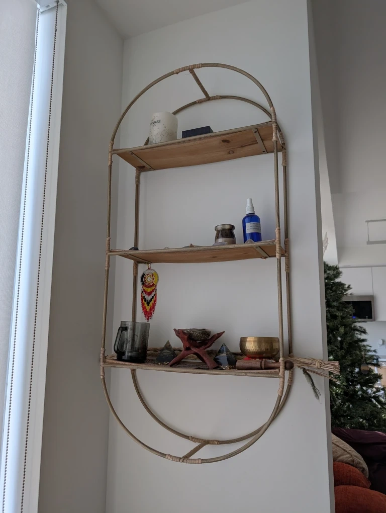 Selling a cute arched woven wall shelf! It's perfect for adding a touch of boho to any room. It has three shelves for displaying your favourite items. It's in great condition and ready for a new home