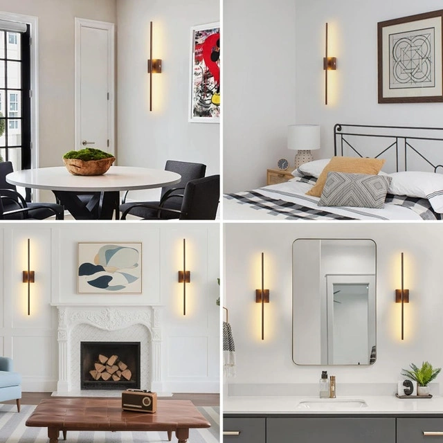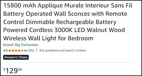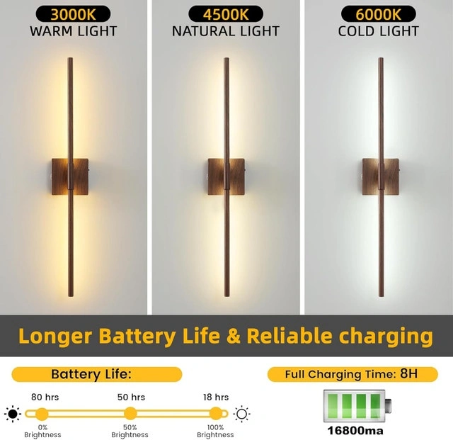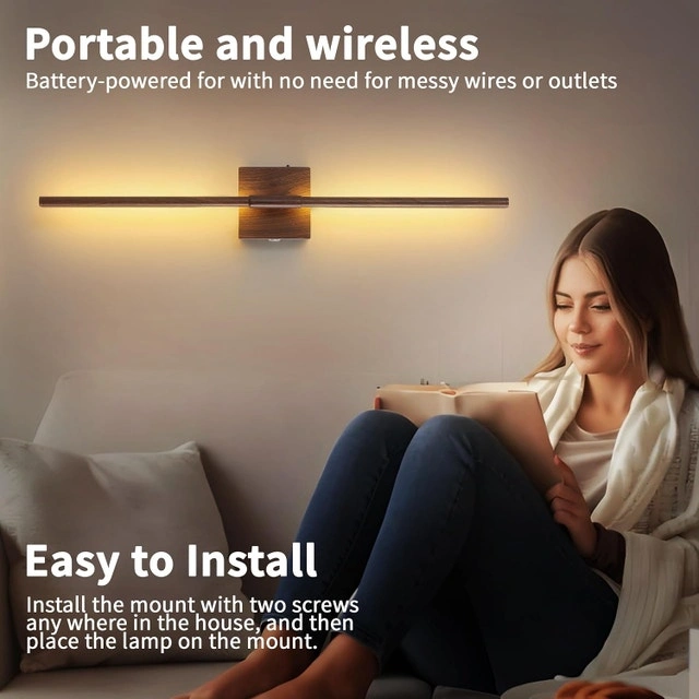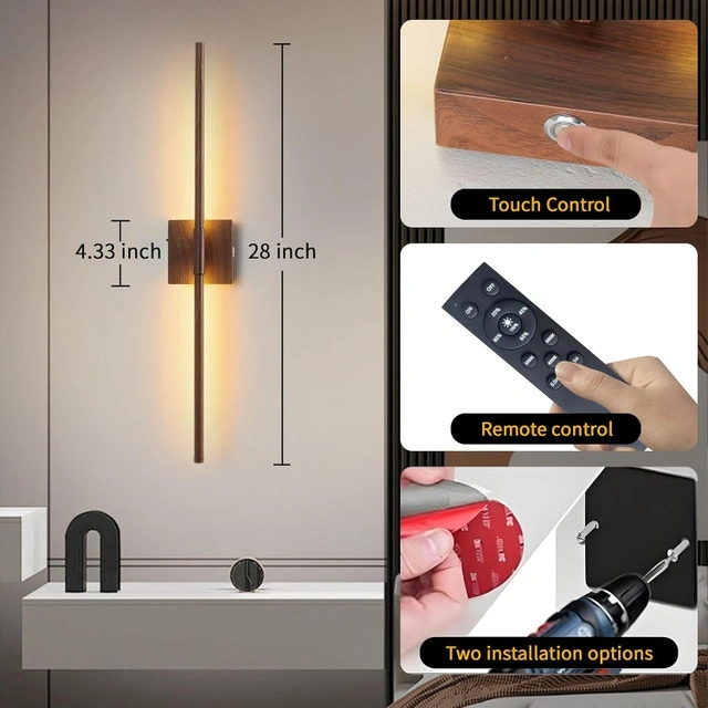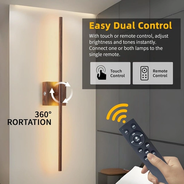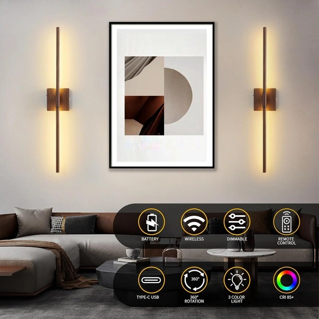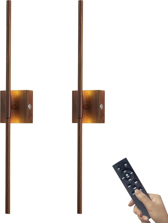 Brand new set of 2 battery operated wireless wall sconces with remote. They feature dimmable, rechargeable, cordless 3000K LED walnut wood lights suitable for the bedroom.