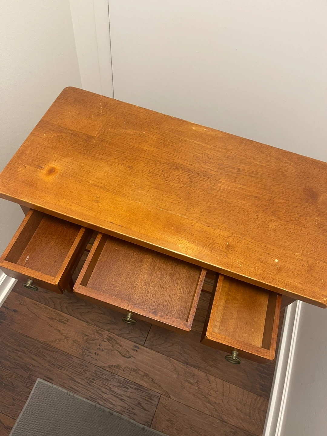 It’s in good condition. There are some signs of wear on the top & around legs but can be easily touched up or re-stained (see pics for reference).